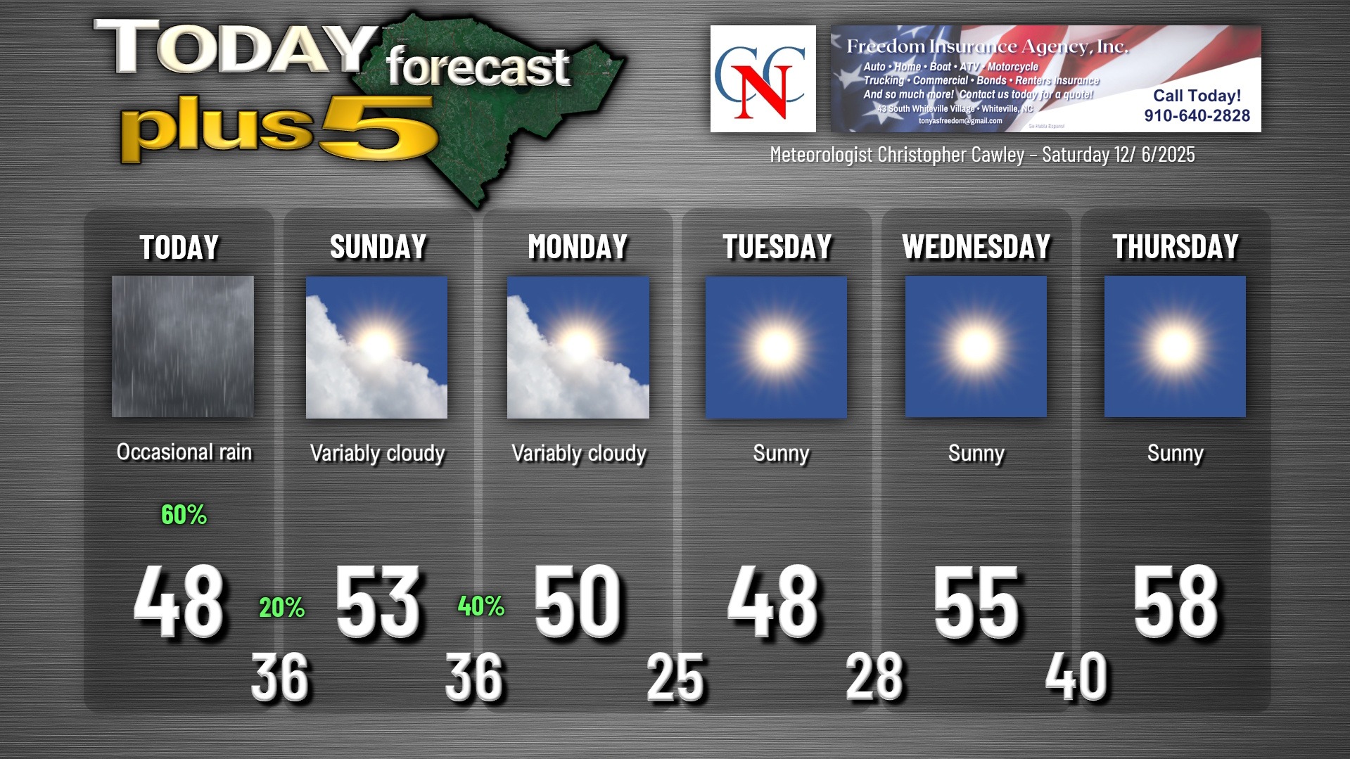 This weather update is sponsored by Freedom Insurance of Whiteville. You can trust Freedom Insurance to give you clear blue skies when it comes to home, car, boat, or whatever insurance you need. Let Freedom provide customized coverage to keep you and your family safe. Contact Freedom today at 910-640-2828!