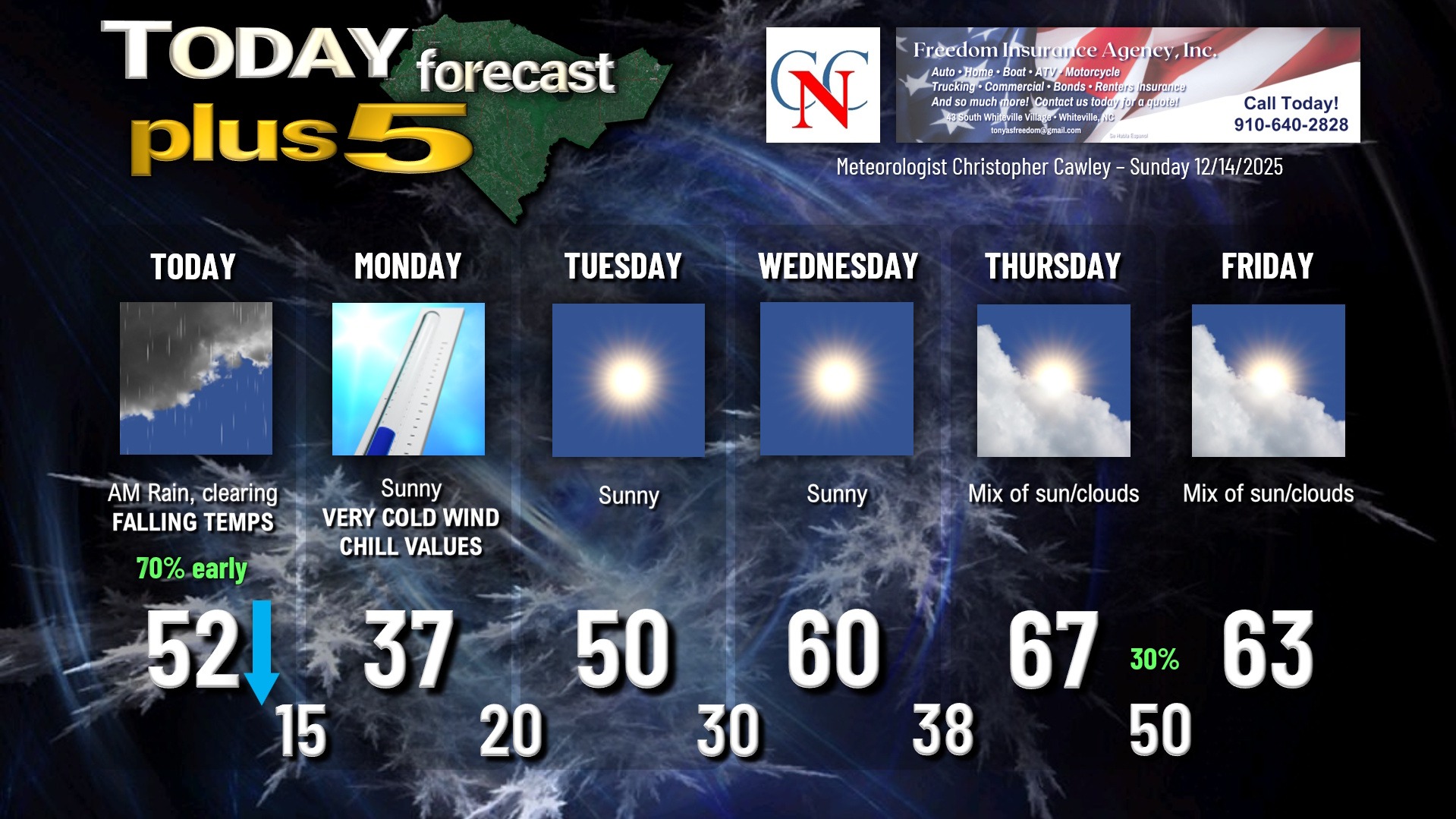 This weather update is sponsored by Freedom Insurance of Whiteville. You can trust Freedom Insurance to give you clear blue skies when it comes to home, car, boat, or whatever insurance you need. Let Freedom provide customized coverage to keep you and your family safe. Contact Freedom today at 910-640-2828!