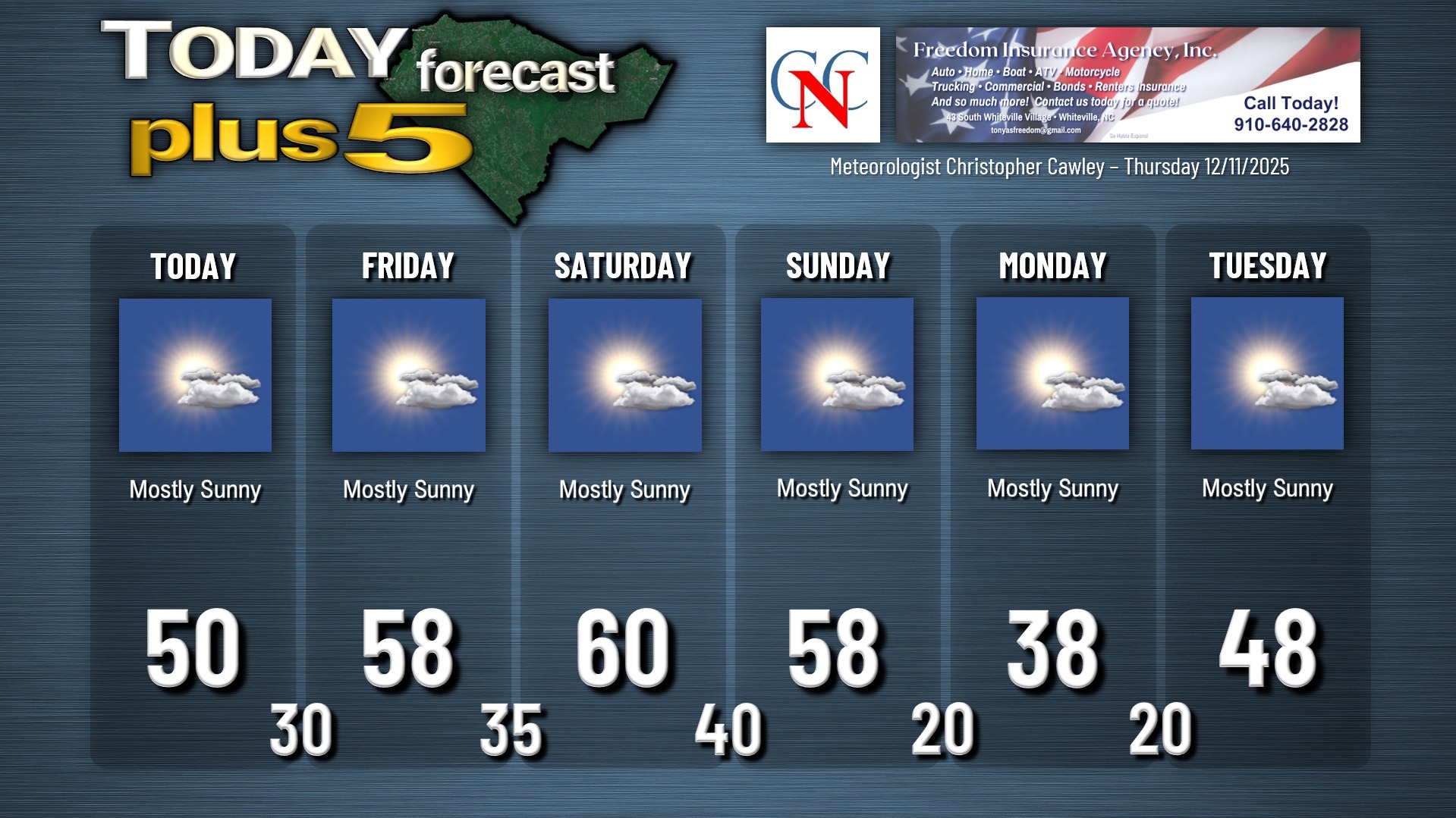 This weather update is sponsored by Freedom Insurance of Whiteville. You can trust Freedom Insurance to give you clear blue skies when it comes to home, car, boat, or whatever insurance you need. Let Freedom provide customized coverage to keep you and your family safe. Contact Freedom today at 910-640-2828!
