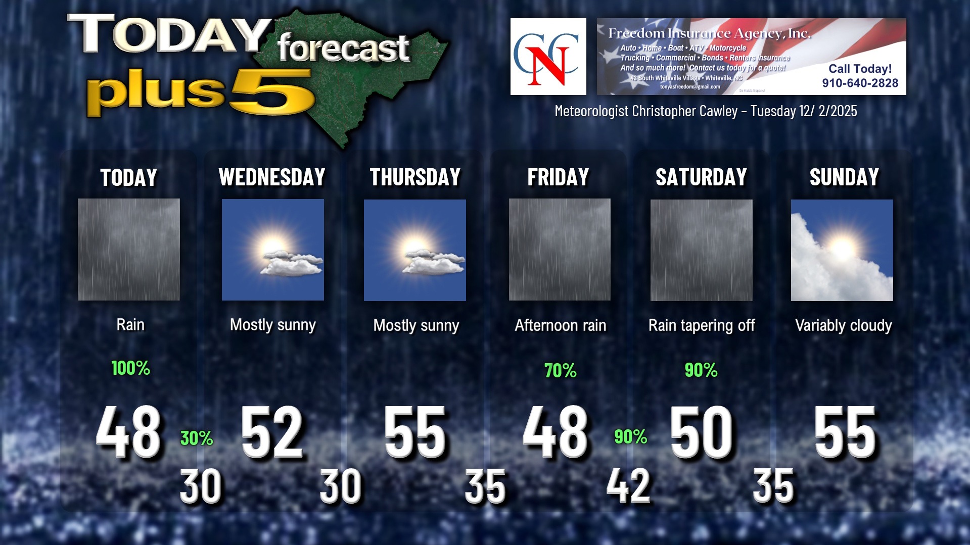 This weather update is sponsored by Freedom Insurance of Whiteville. You can trust Freedom Insurance to give you clear blue skies when it comes to home, car, boat, or whatever insurance you need. Let Freedom provide customized coverage to keep you and your family safe. Contact Freedom today at 910-640-2828!