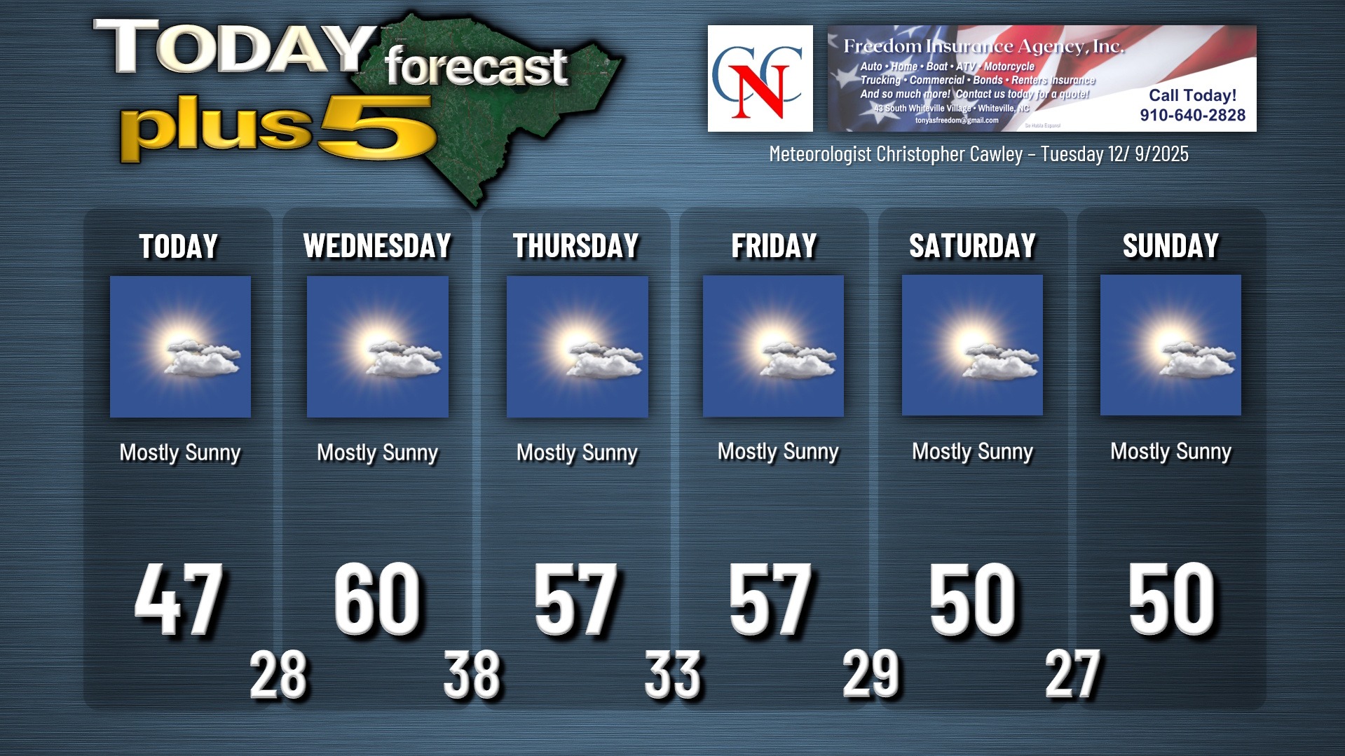 This weather update is sponsored by Freedom Insurance of Whiteville. You can trust Freedom Insurance to give you clear blue skies when it comes to home, car, boat, or whatever insurance you need. Let Freedom provide customized coverage to keep you and your family safe. Contact Freedom today at 910-640-2828!