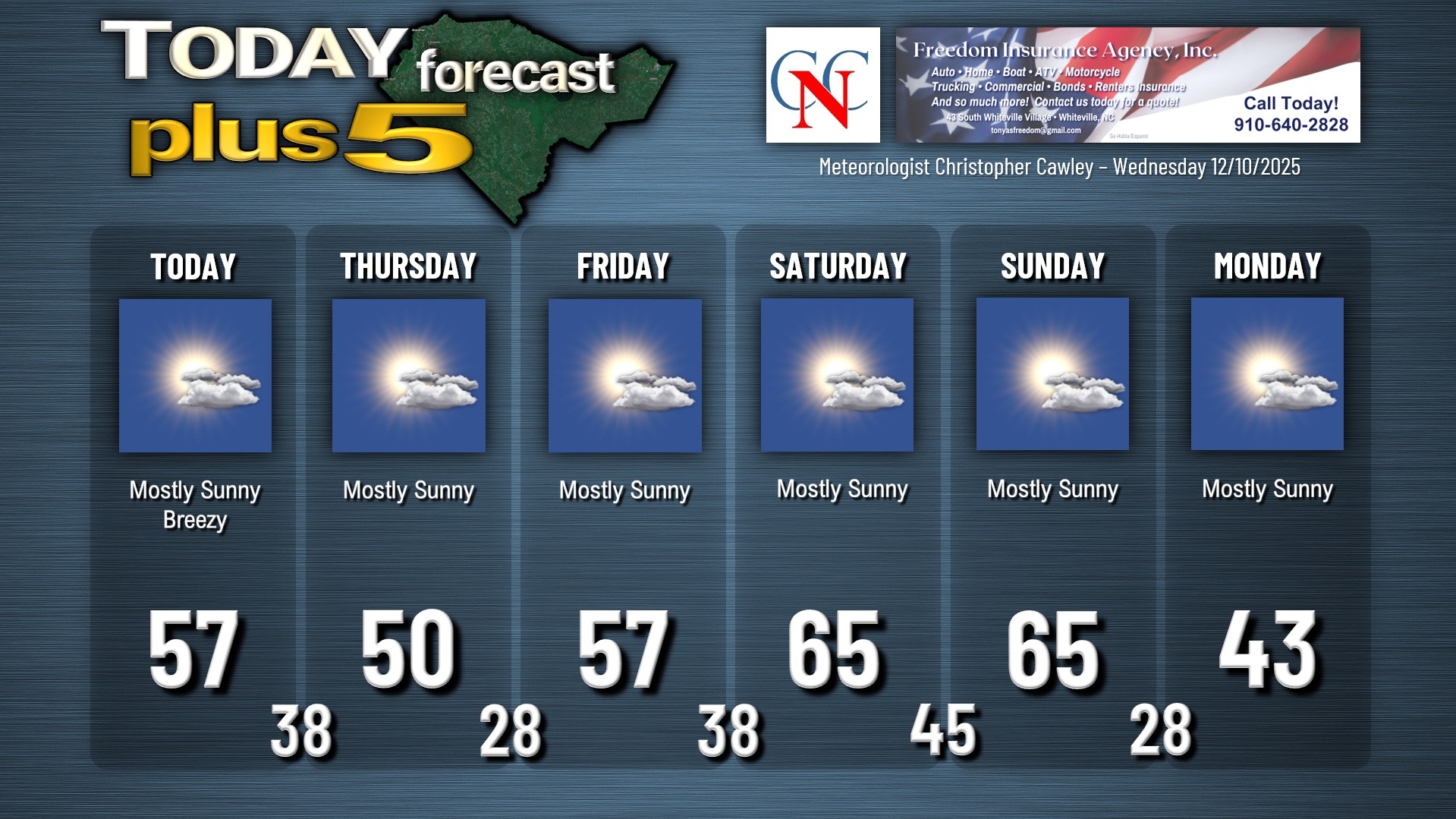 This weather update is sponsored by Freedom Insurance of Whiteville. You can trust Freedom Insurance to give you clear blue skies when it comes to home, car, boat, or whatever insurance you need. Let Freedom provide customized coverage to keep you and your family safe. Contact Freedom today at 910-640-2828!