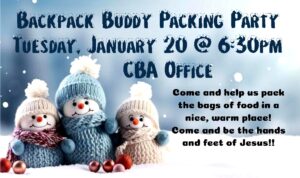The next Backpack Buddy packing party will be on Jan. 20 at 6:30 p.m. at the Columbus Baptist Association office. The purpose of the ministry is to provide food for children over the weekend who may not otherwise have another meal until returning to school on Monday.