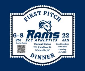 Southeastern Community College Athletics will have their First Pitch Dinner on Jan. 22 from 6-8 p.m. at Vineland Station in Whiteville. This special evening brings together the community, SCC baseball team, and new athletic staff as they kick off the spring season. Guest will enjoy dinner catered by Joe’s BBQ and hear from guest speaker Steve Mintz.