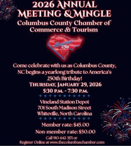 The Columbus County Chamber of Commerce and Tourism will be having their 2026 Annual Meeting and Mingle on Jan. 29 from 5:30-7:30 p.m. Tickets are $45 for members and $50 for non-members, and the event will be held at the Vineland Station Depot.