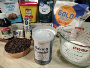 For this recipe, you’re going to need one and a half cups of sugar, three fourths of a cup of melted unsalted butter, a half of a cup of cocoa powder, one and a half cups of all-purpose flour, one teaspoon of baking powder, a half of a teaspoon of baking soda, a half of a teaspoon of salt, two large eggs, one teaspoon of vanilla, one cup of milk, and one cup of chocolate chips.