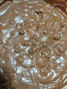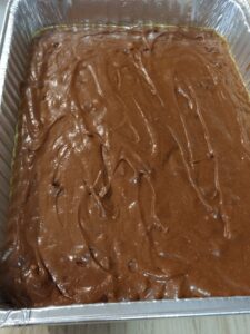 Pour the brownie mixture into your greased pan and evenly spread it edge to edge with the cake spatula. Put it in your preheated oven and bake it 35-45 or until a toothpick comes out clean.