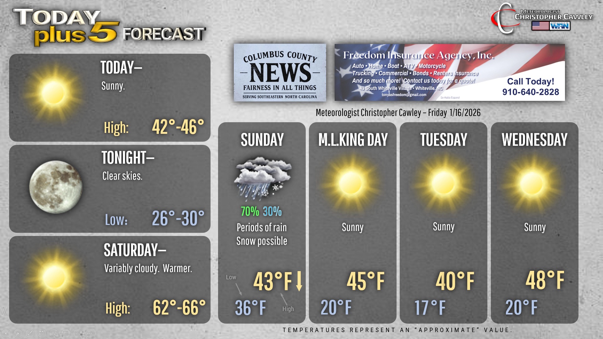 This weather update is sponsored by Freedom Insurance of Whiteville. You can trust Freedom Insurance to give you clear blue skies when it comes to home, car, boat, or whatever insurance you need. Let Freedom provide customized coverage to keep you and your family safe. Contact Freedom today at 910-640-2828!