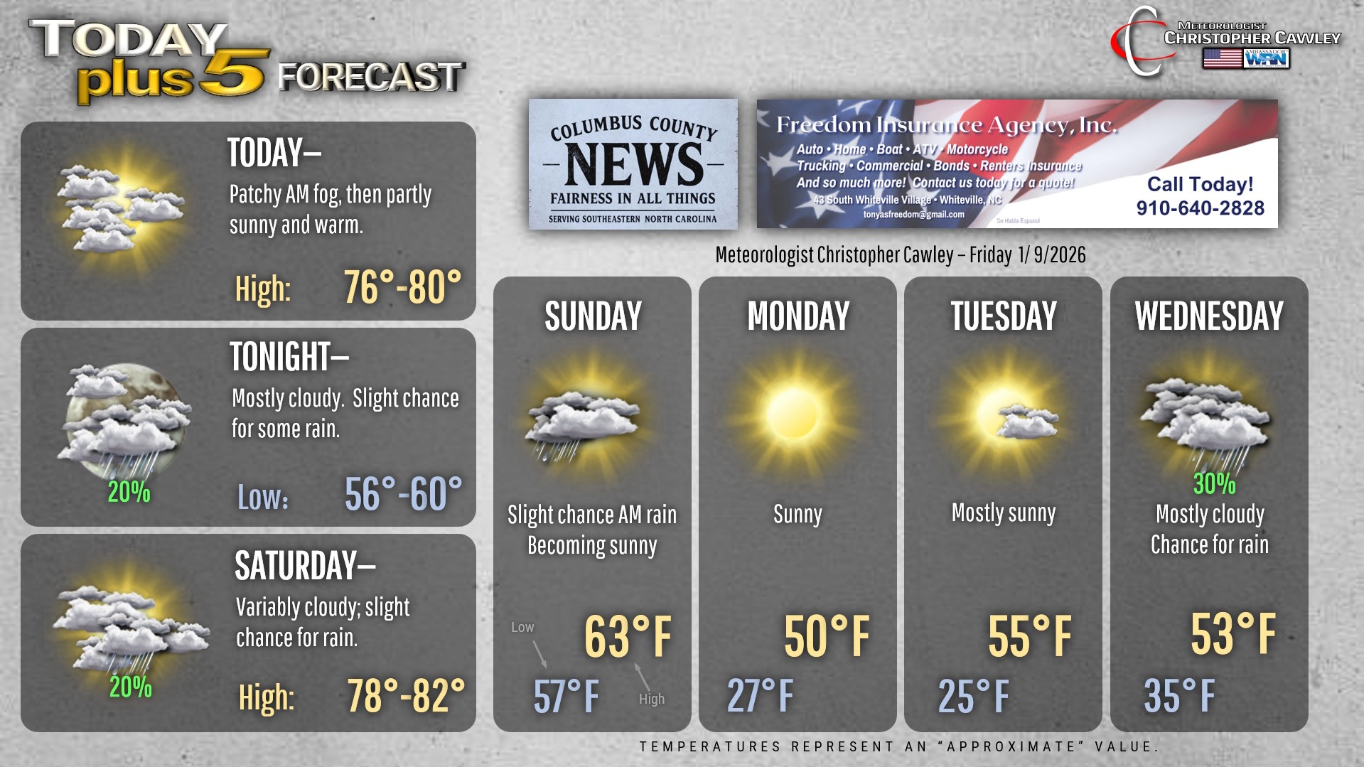 This weather update is sponsored by Freedom Insurance of Whiteville. You can trust Freedom Insurance to give you clear blue skies when it comes to home, car, boat, or whatever insurance you need. Let Freedom provide customized coverage to keep you and your family safe. Contact Freedom today at 910-640-2828!