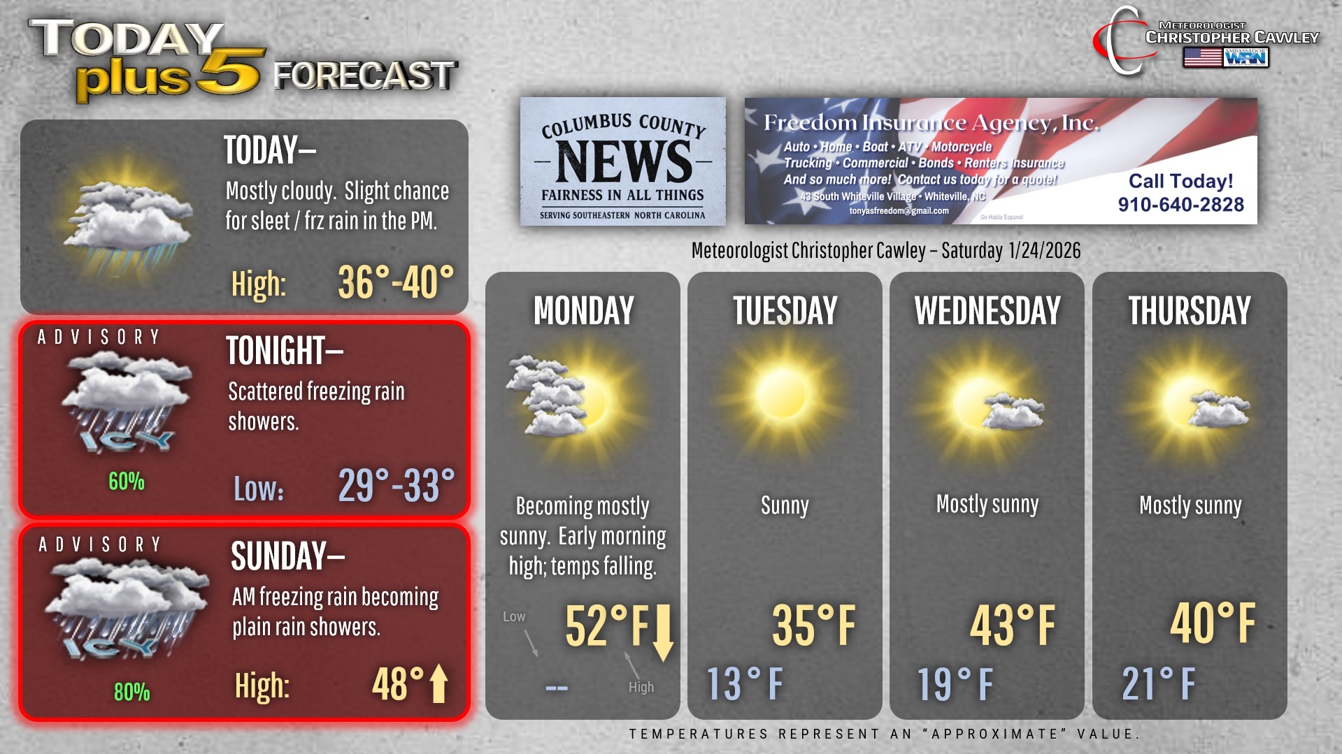 This weather update is sponsored by Freedom Insurance of Whiteville. You can trust Freedom Insurance to give you clear blue skies when it comes to home, car, boat, or whatever insurance you need. Let Freedom provide customized coverage to keep you and your family safe. Contact Freedom today at 910-640-2828!