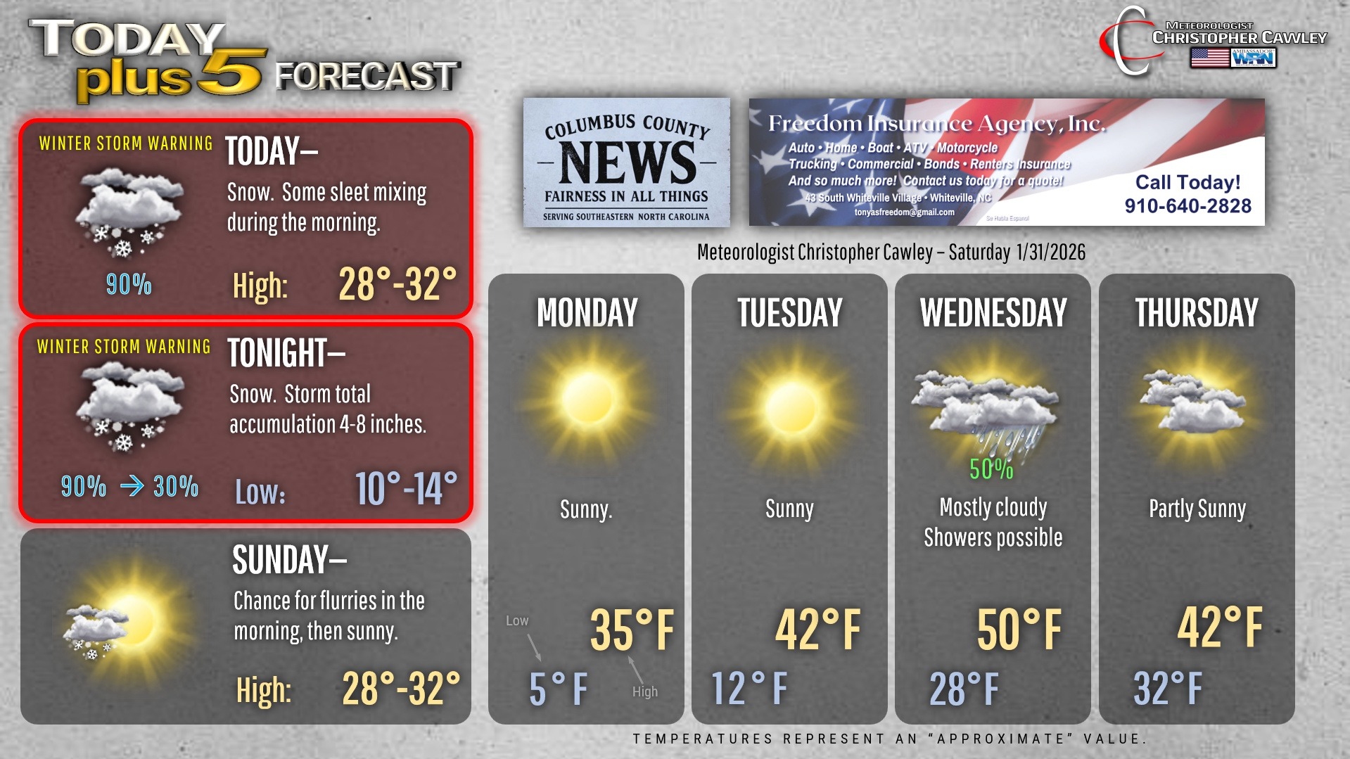 This weather update is sponsored by Freedom Insurance of Whiteville. You can trust Freedom Insurance to give you clear blue skies when it comes to home, car, boat, or whatever insurance you need. Let Freedom provide customized coverage to keep you and your family safe. Contact Freedom today at 910-640-2828!