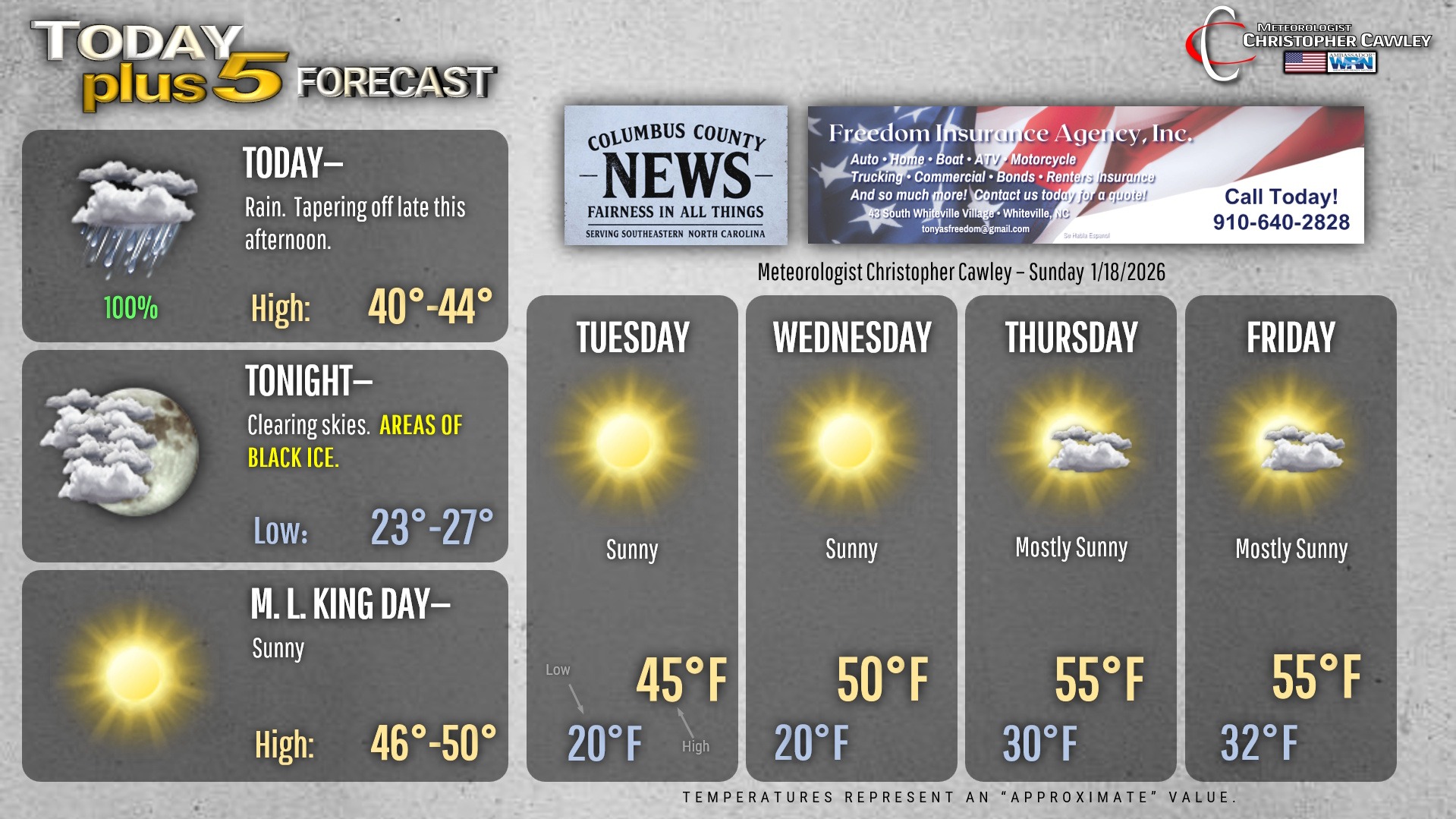 This weather update is sponsored by Freedom Insurance of Whiteville. You can trust Freedom Insurance to give you clear blue skies when it comes to home, car, boat, or whatever insurance you need. Let Freedom provide customized coverage to keep you and your family safe. Contact Freedom today at 910-640-2828!