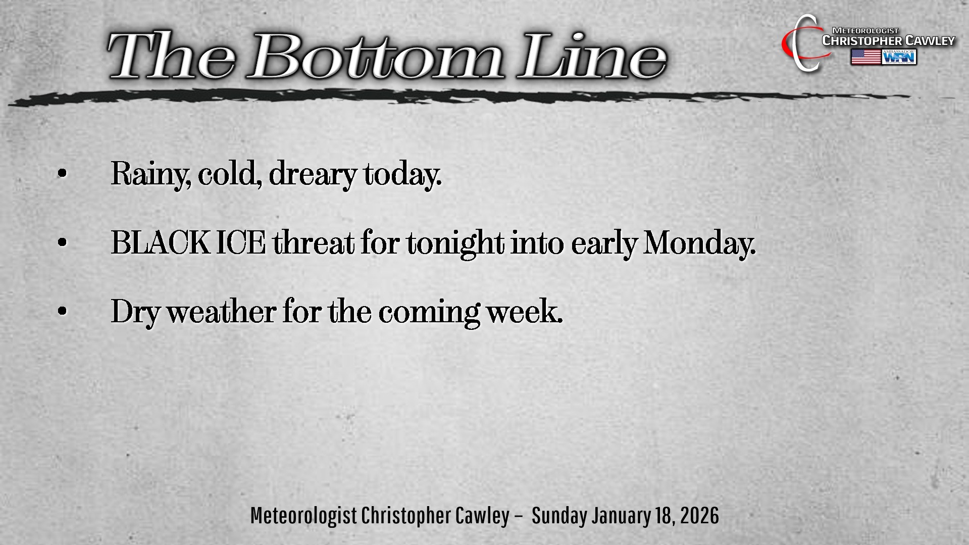 Dry air quickly pushing in will help to dry road surfaces, but AREAS OF BLACK ICE will be a concern for those traveling first thing Monday morning. Bridges and overpasses, “shady areas” (sheltered areas) and curves may be quite slick in spots. Give yourself a little bit of extra travel time Monday.