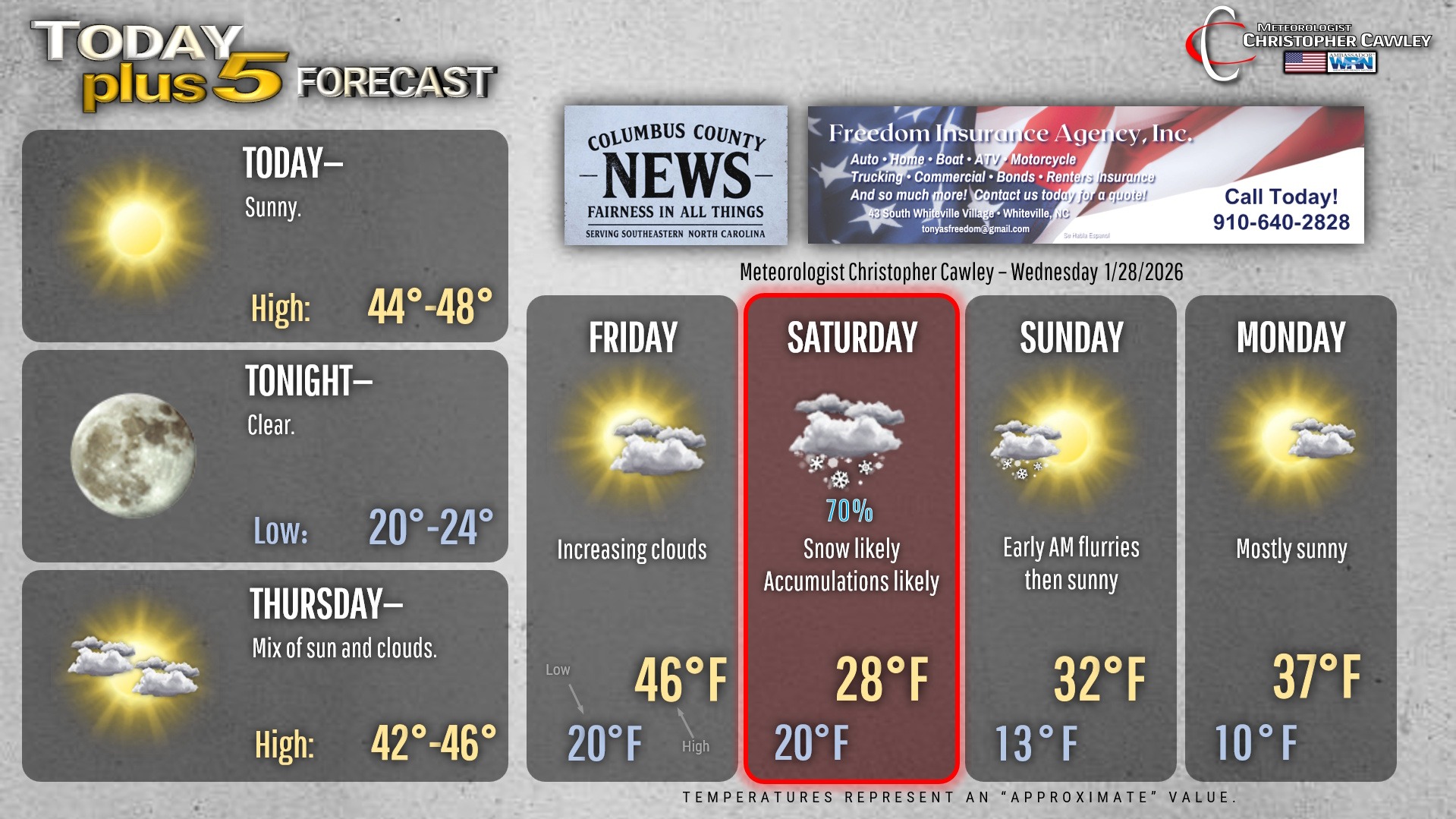 This weather update is sponsored by Freedom Insurance of Whiteville. You can trust Freedom Insurance to give you clear blue skies when it comes to home, car, boat, or whatever insurance you need. Let Freedom provide customized coverage to keep you and your family safe. Contact Freedom today at 910-640-2828!