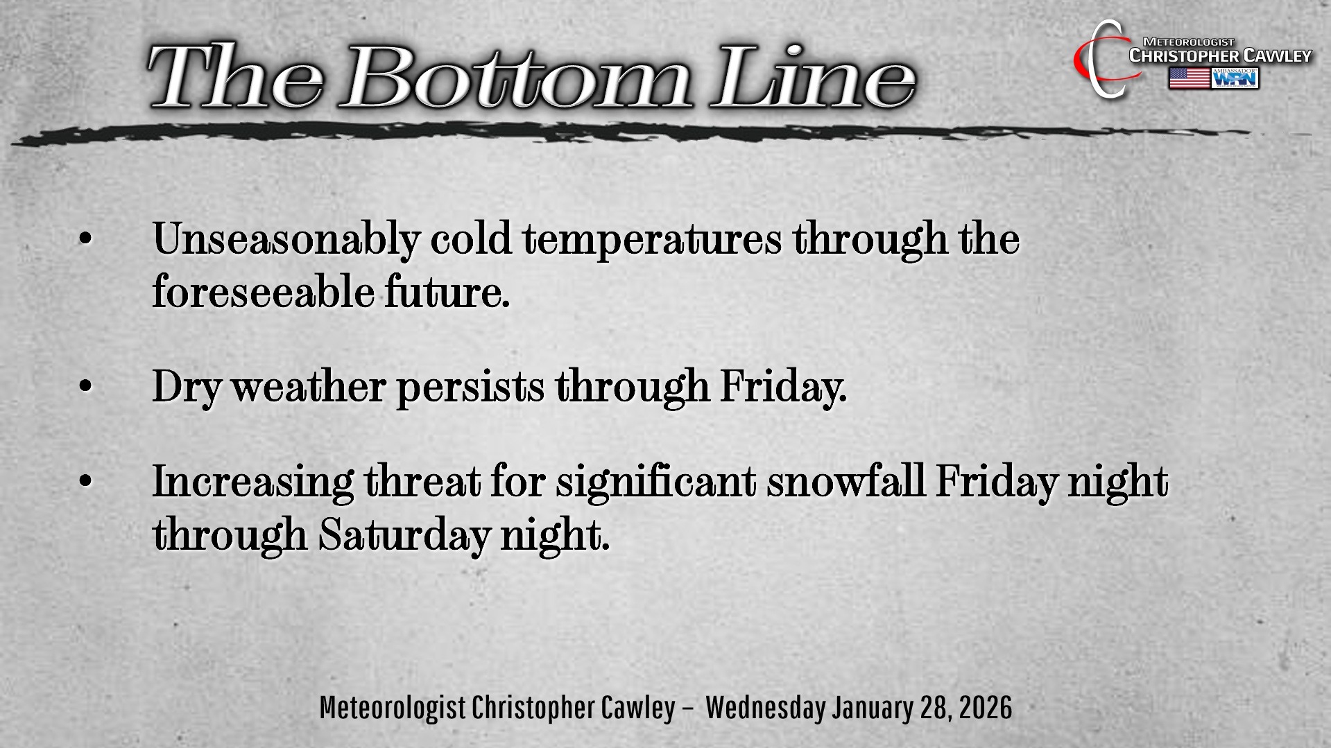 Cold and dry weather will continue through the end of the week, with temperatures running 10+ degrees below seasonal normal values. Weather conditions will continue to be remarkably unremarkable … until late Friday.