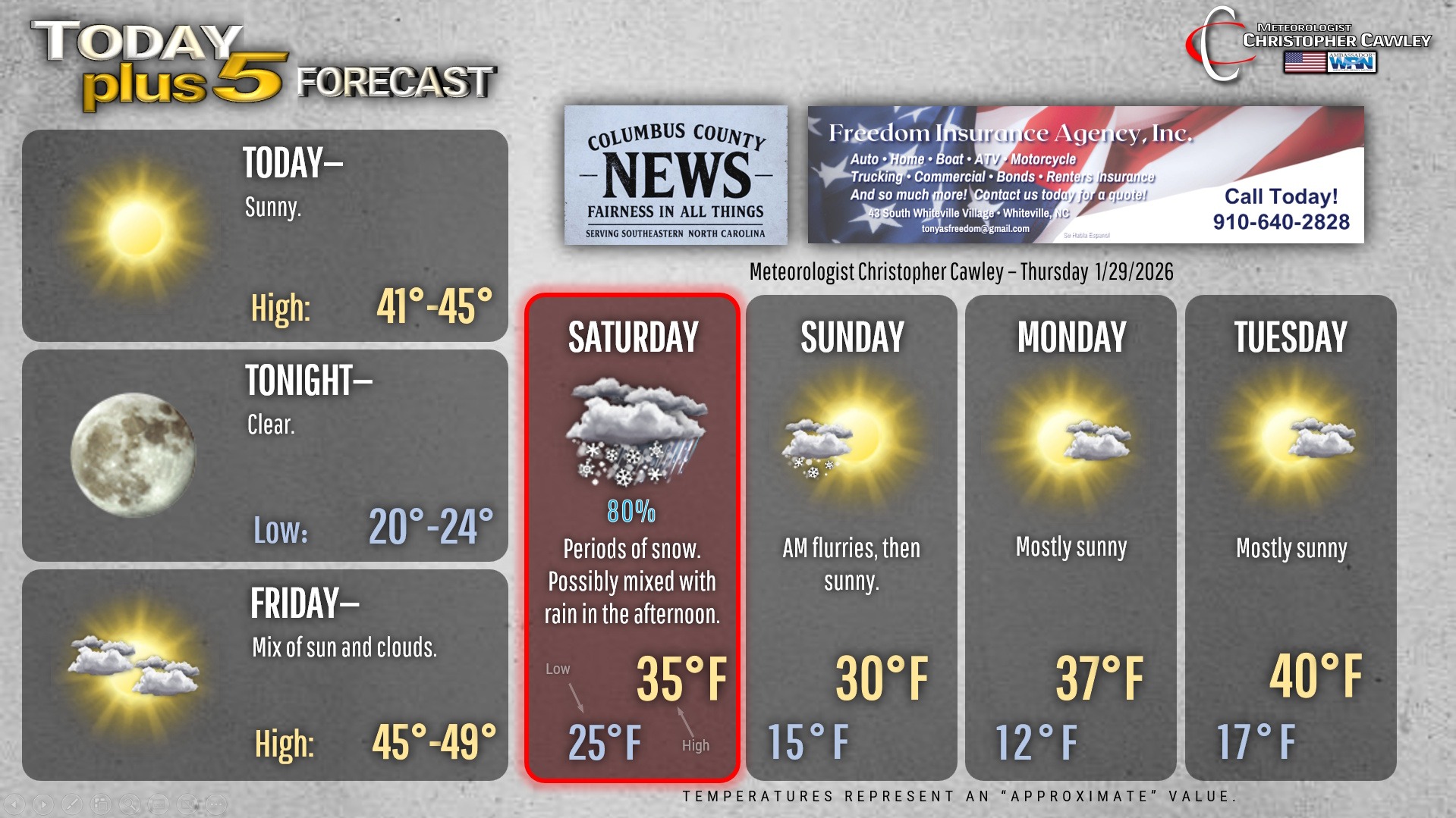 This weather update is sponsored by Freedom Insurance of Whiteville. You can trust Freedom Insurance to give you clear blue skies when it comes to home, car, boat, or whatever insurance you need. Let Freedom provide customized coverage to keep you and your family safe. Contact Freedom today at 910-640-2828!