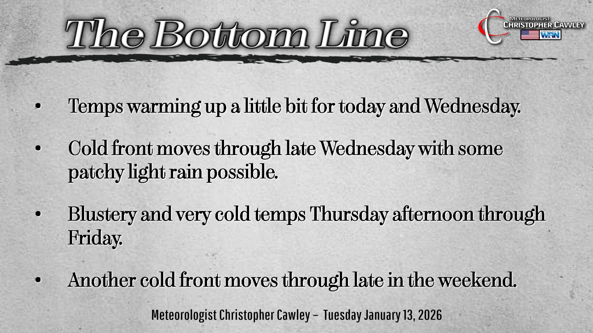 CCN Weather Update for Tuesday January 13, 2026.