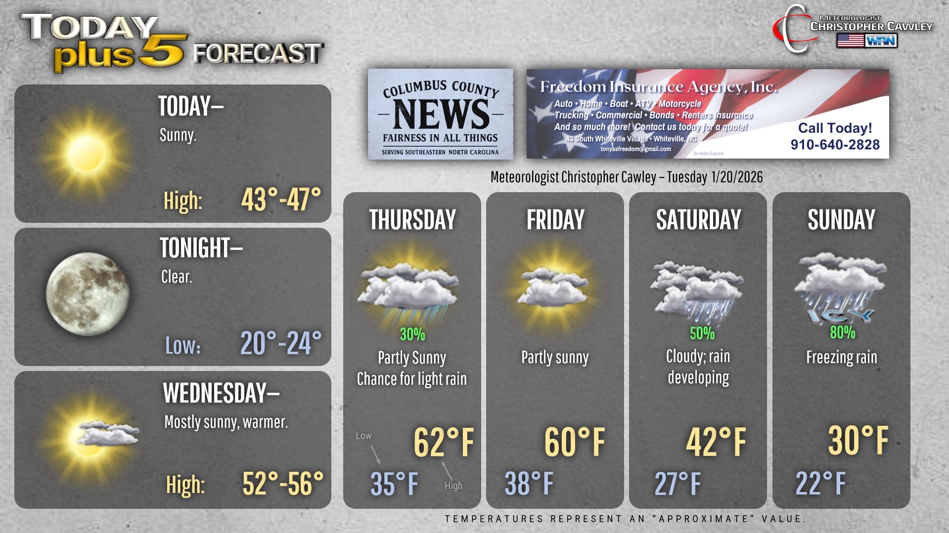 This weather update is sponsored by Freedom Insurance of Whiteville. You can trust Freedom Insurance to give you clear blue skies when it comes to home, car, boat, or whatever insurance you need. Let Freedom provide customized coverage to keep you and your family safe. Contact Freedom today at 910-640-2828!