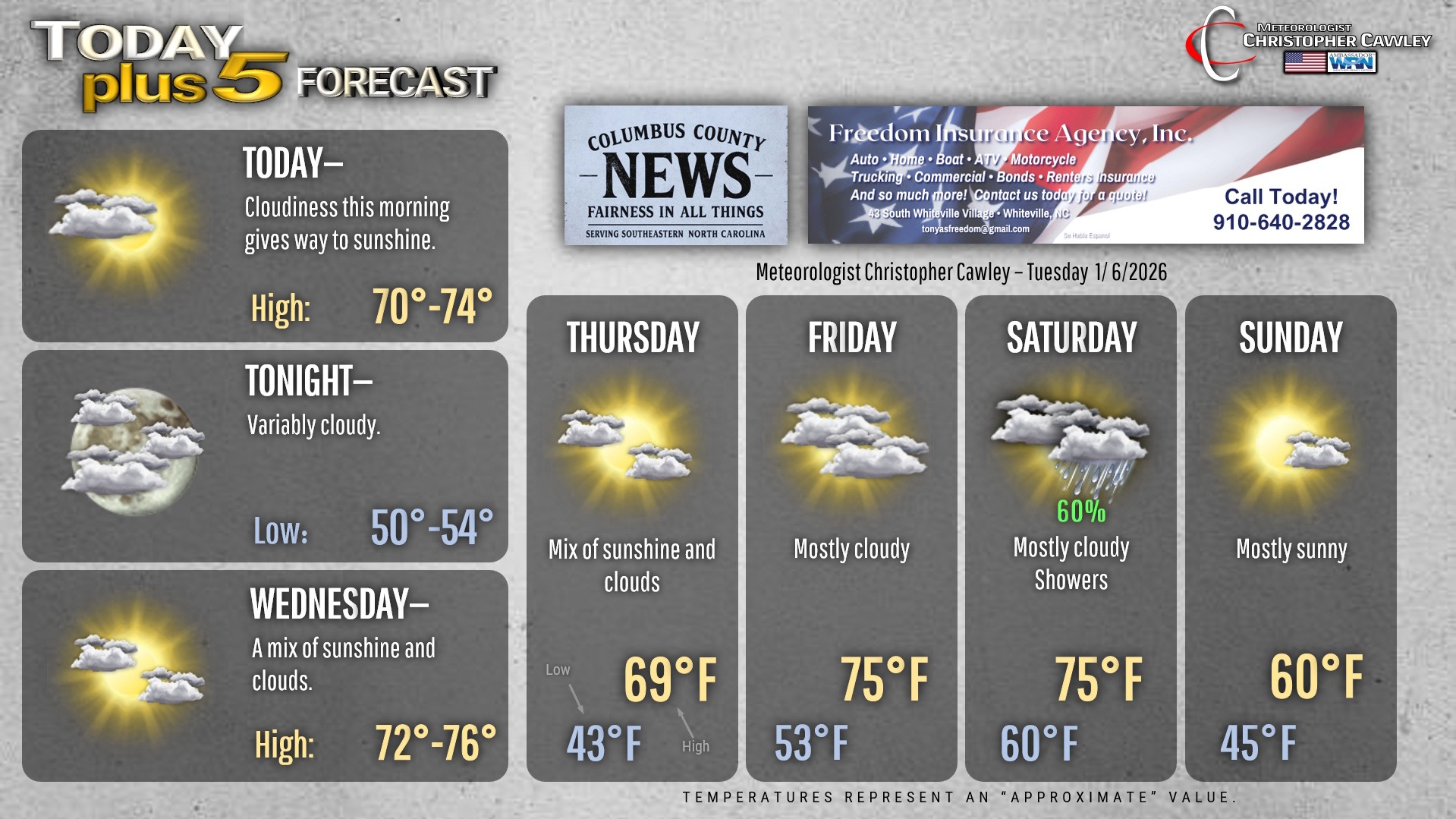 This weather update is sponsored by Freedom Insurance of Whiteville. You can trust Freedom Insurance to give you clear blue skies when it comes to home, car, boat, or whatever insurance you need. Let Freedom provide customized coverage to keep you and your family safe. Contact Freedom today at 910-640-2828!