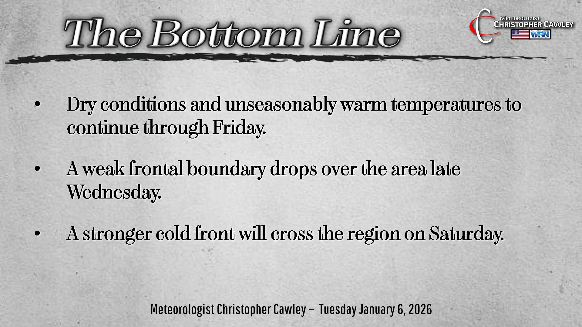 Unseasonable warmth will continue into the weekend, with dry weather through Friday. The overall “big picture” pattern is one of a southerly to southwesterly flow of warm air. However, a little wrinkle in that is a cold front (if you want to call it that) will drop down over the area Wednesday evening. This will result in temporarily “cooler” temps Wednesday night and Thursday.