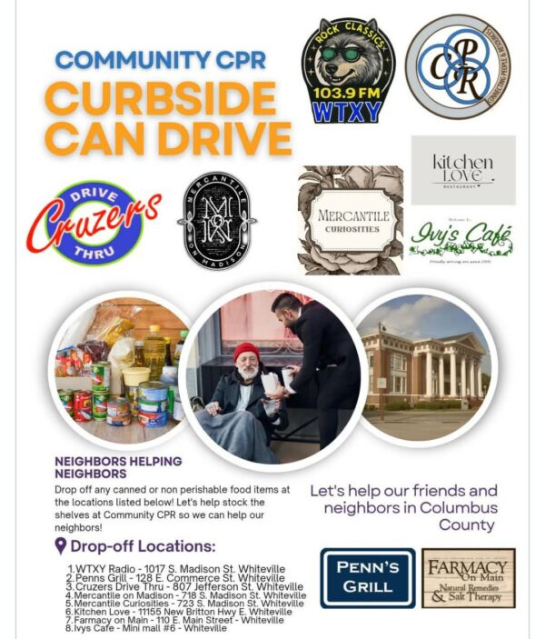 You can drop off any canned or non-perishable food items at the Whiteville locations listed below. Help stock the shelves at Community CPR to keep folks in Columbus County from going hungry.