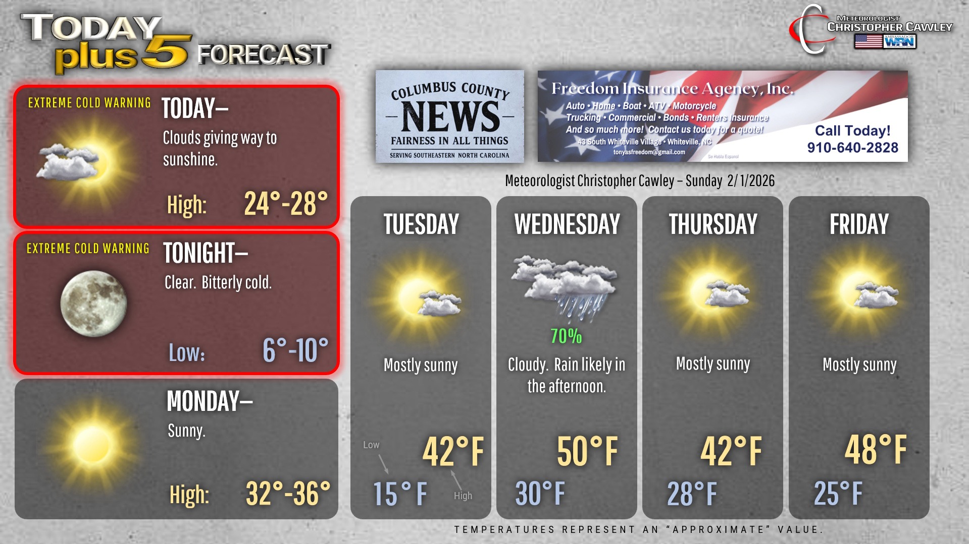 This weather update is sponsored by Freedom Insurance of Whiteville. You can trust Freedom Insurance to give you clear blue skies when it comes to home, car, boat, or whatever insurance you need. Let Freedom provide customized coverage to keep you and your family safe. Contact Freedom today at 910-640-2828!