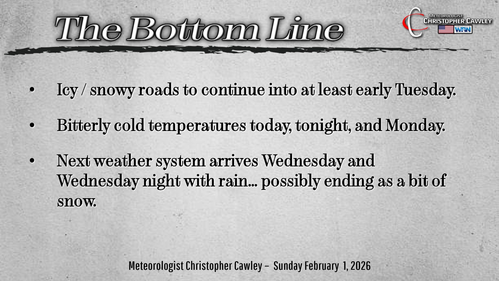 Also be prepared for dangerously icy and snow-covered roads until at least TUESDAY. DOT crews will be doing the best they can to get them cleared, but with 6-12 inches of new snow, it’s going to take a few minutes to get that done. Secondary roads will be VERY ICY and SNOWY. If you MUST travel, it is imperative that you give yourself PLENTY of extra travel time. Call ahead… the place you want to go might be closed.