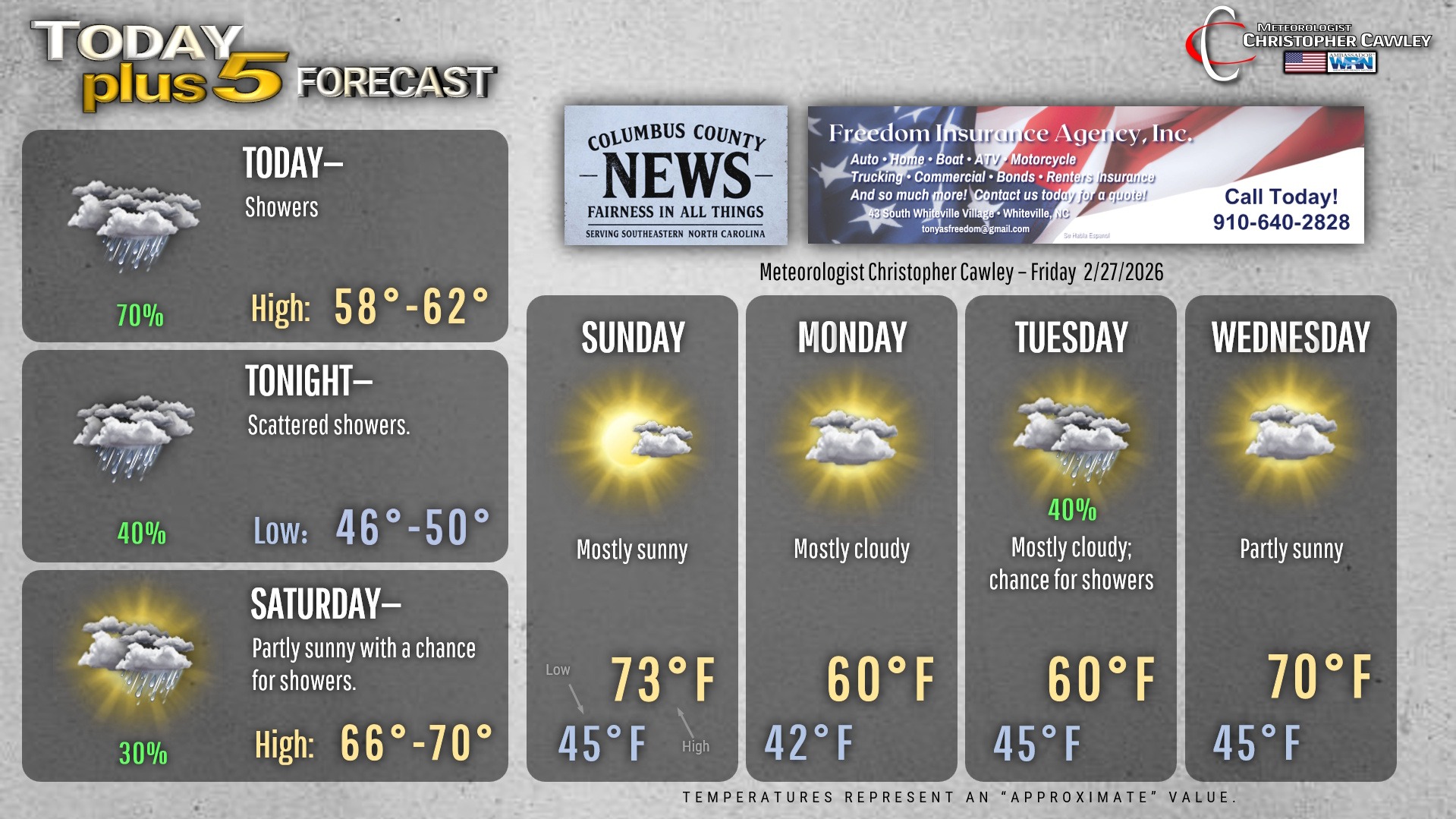 This weather update is sponsored by Freedom Insurance of Whiteville. You can trust Freedom Insurance to give you clear blue skies when it comes to home, car, boat, or whatever insurance you need. Let Freedom provide customized coverage to keep you and your family safe. Contact Freedom today at 910-640-2828!