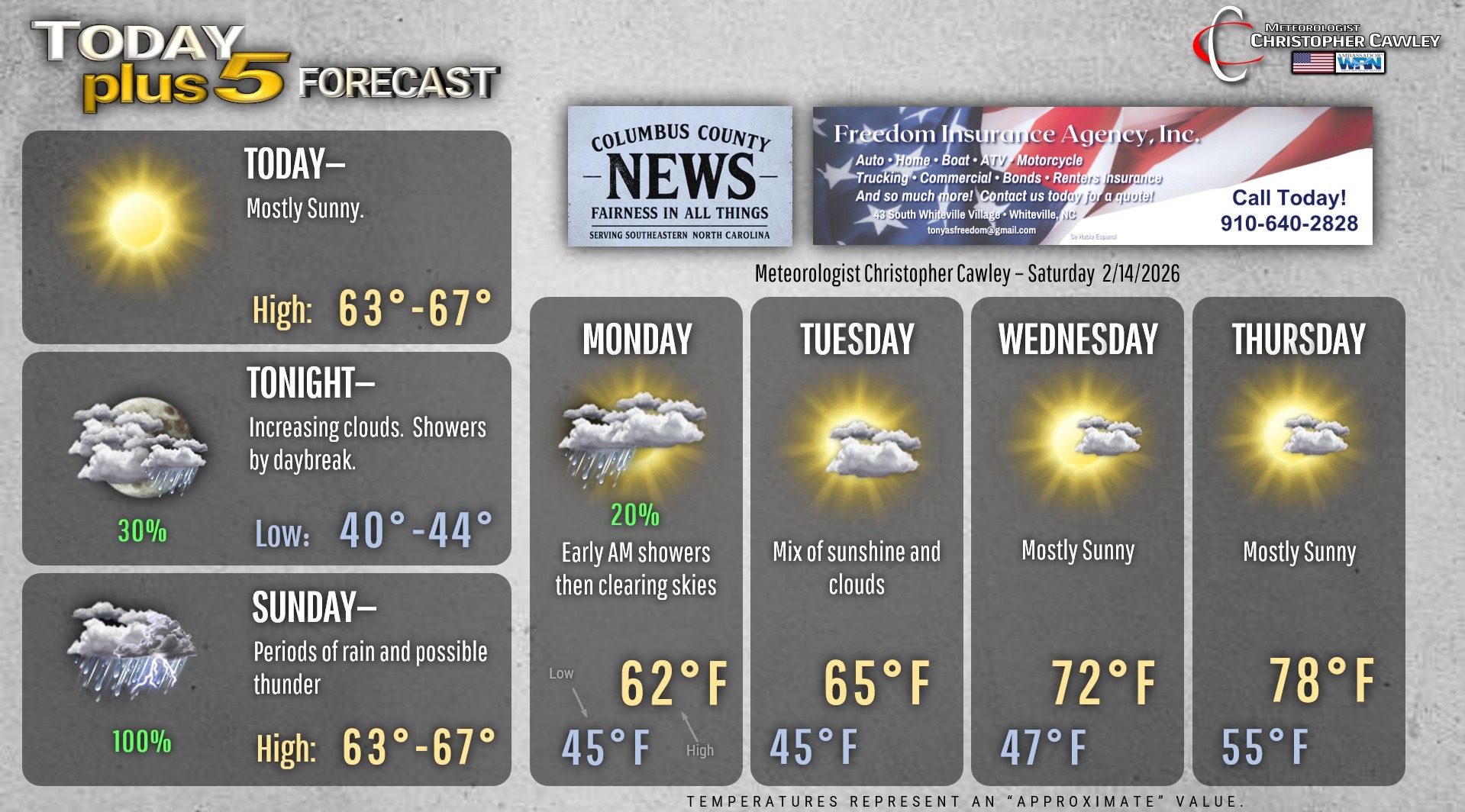 This weather update is sponsored by Freedom Insurance of Whiteville. You can trust Freedom Insurance to give you clear blue skies when it comes to home, car, boat, or whatever insurance you need. Let Freedom provide customized coverage to keep you and your family safe. Contact Freedom today at 910-640-2828!
