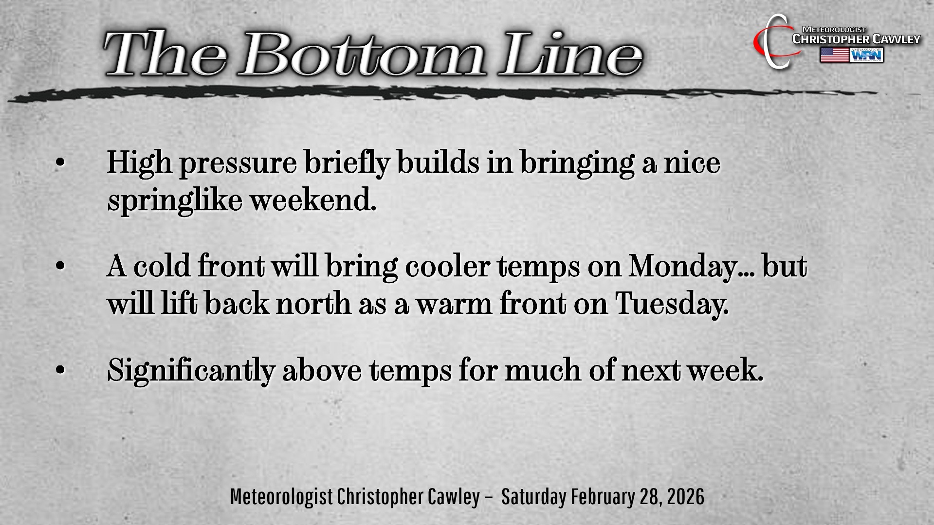 Sunday will be a perfect 10 with nothing but sunshine, highs in the mid 70s… definitely get out and enjoy it.
