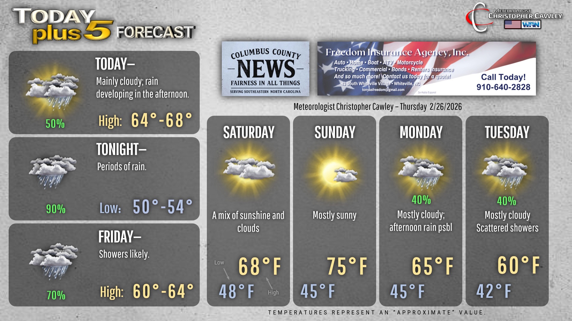 This weather update is sponsored by Freedom Insurance of Whiteville. You can trust Freedom Insurance to give you clear blue skies when it comes to home, car, boat, or whatever insurance you need. Let Freedom provide customized coverage to keep you and your family safe. Contact Freedom today at 910-640-2828!