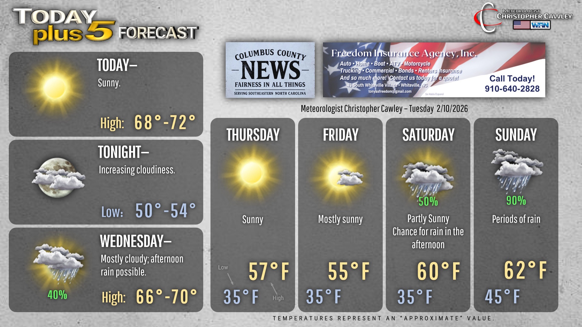 This weather update is sponsored by Freedom Insurance of Whiteville. You can trust Freedom Insurance to give you clear blue skies when it comes to home, car, boat, or whatever insurance you need. Let Freedom provide customized coverage to keep you and your family safe. Contact Freedom today at 910-640-2828!