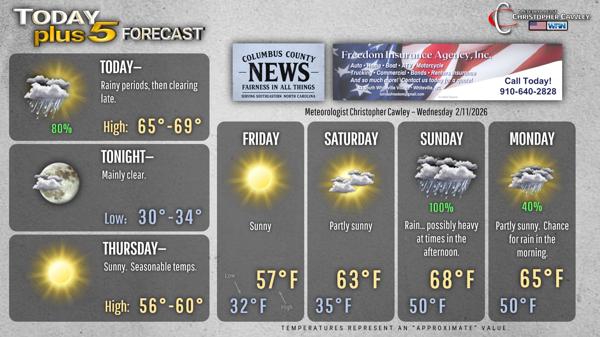 This weather update is sponsored by Freedom Insurance of Whiteville. You can trust Freedom Insurance to give you clear blue skies when it comes to home, car, boat, or whatever insurance you need. Let Freedom provide customized coverage to keep you and your family safe. Contact Freedom today at 910-640-2828!
