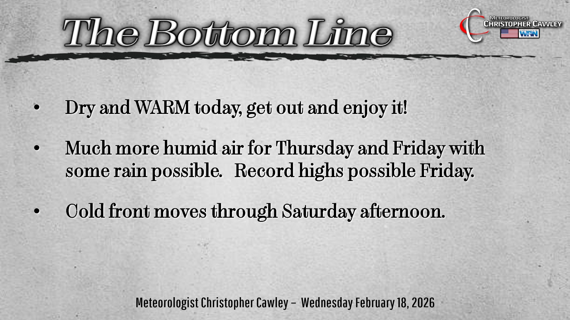 Unseasonably warm temperatures will dominate the area today through Friday. Much more humid subtropical air will introduce the threat for some light rain showers Thursday and Friday. I’m not really sold on any overall amounts… I think whatever rain we get will be light and spotty.