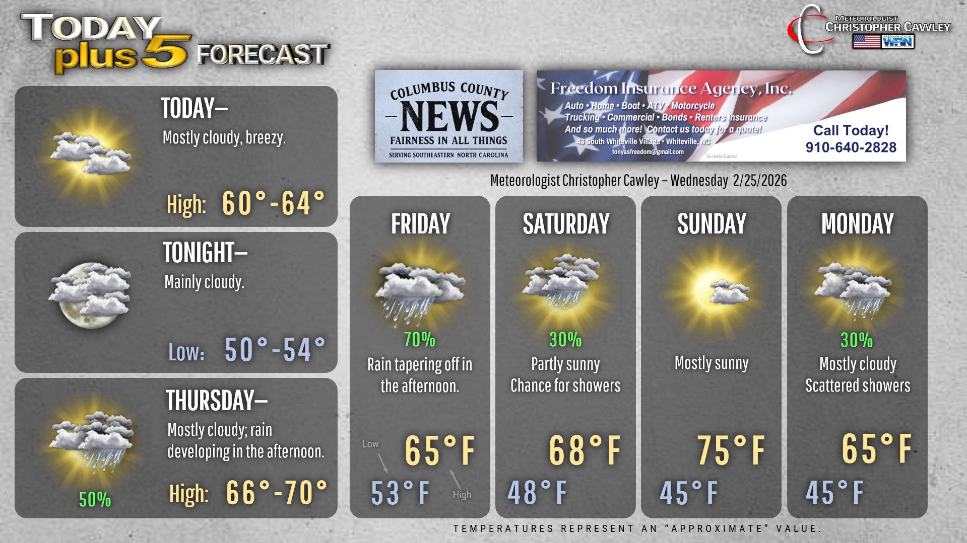 This weather update is sponsored by Freedom Insurance of Whiteville. You can trust Freedom Insurance to give you clear blue skies when it comes to home, car, boat, or whatever insurance you need. Let Freedom provide customized coverage to keep you and your family safe. Contact Freedom today at 910-640-2828!