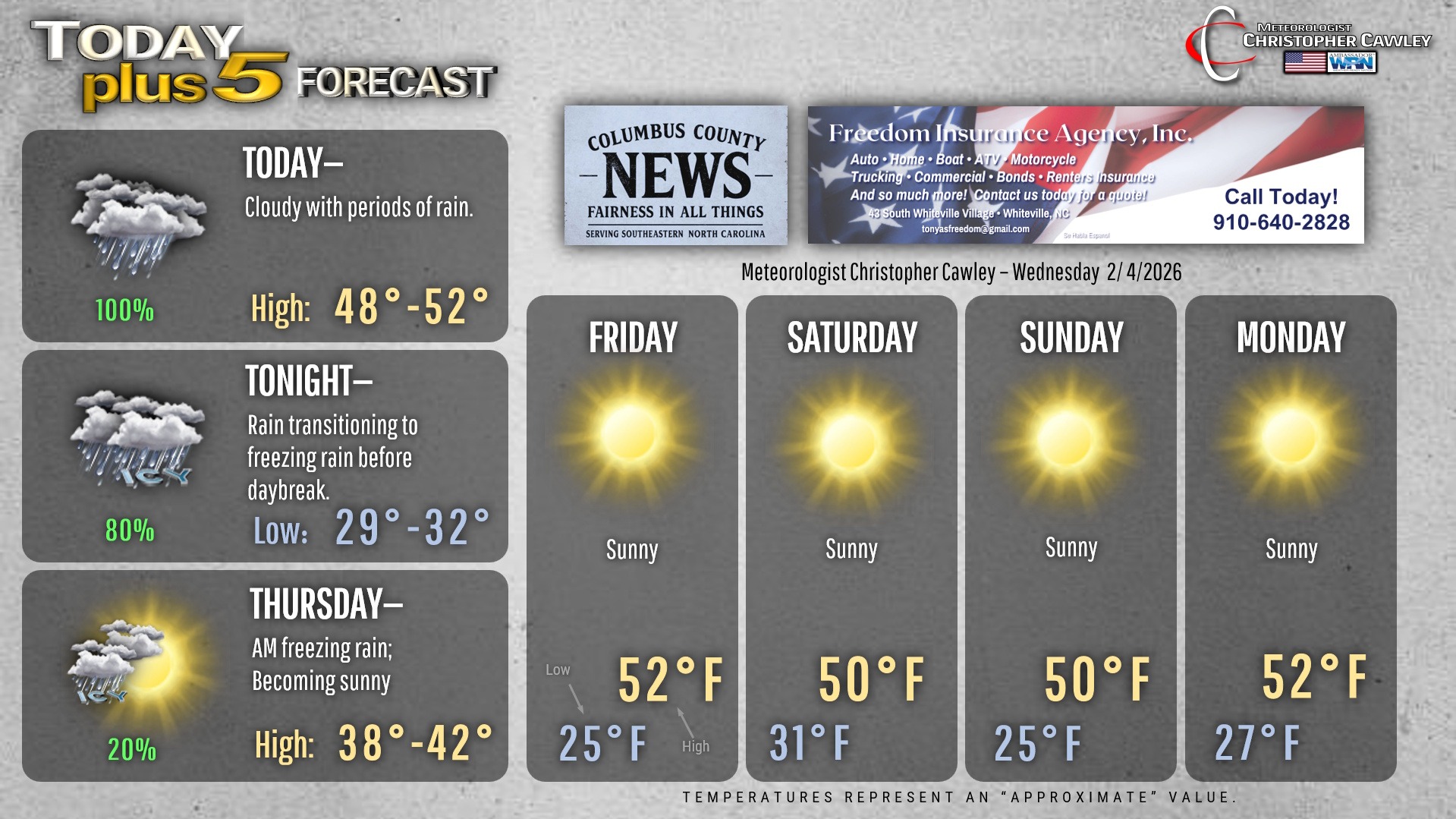 This weather update is sponsored by Freedom Insurance of Whiteville. You can trust Freedom Insurance to give you clear blue skies when it comes to home, car, boat, or whatever insurance you need. Let Freedom provide customized coverage to keep you and your family safe. Contact Freedom today at 910-640-2828!