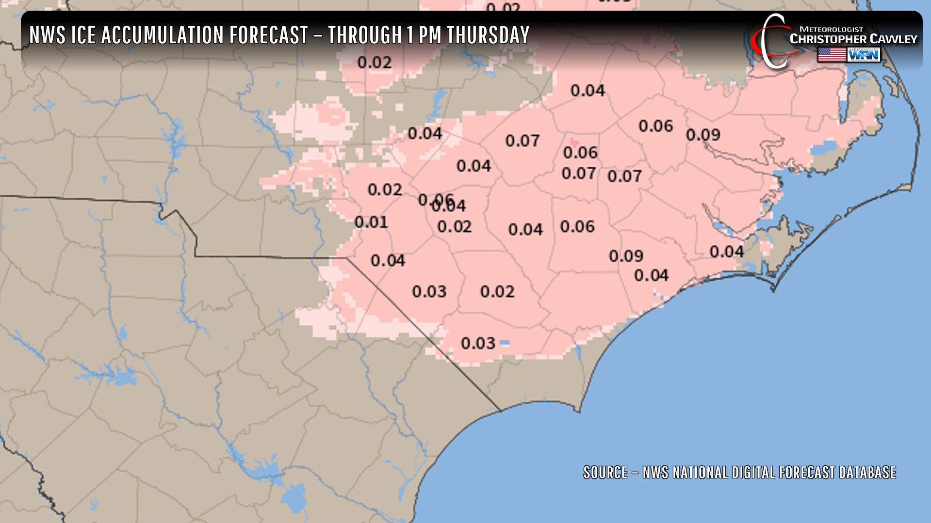 I am not expecting a significant amount of freezing rain; in fact, the National Weather Service is painting the northern half of the county with about 0.03″, which is essentially a light glaze. HOWEVER, this light glaze may make secondary roads, as well as bridges and overpasses, quite slippery early Thursday morning.