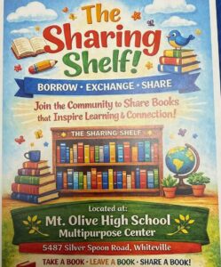 Speaking of libraries, an opportunity for the community to borrow, exchange, or share books will be coming to Whiteville. The Sharing Shelf will allow folks to inspire learning and connection through the love of reading at the Mt. Olive High School Multipurpose Center.