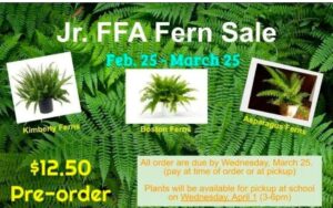 Edgewood Elementary’s Jr. FFA will be taking orders for their fern sale through March 25. The plants will arrive on April 1 just in time for Easter, and you can pick them up at the school, or several of the kids will even deliver them to your door.