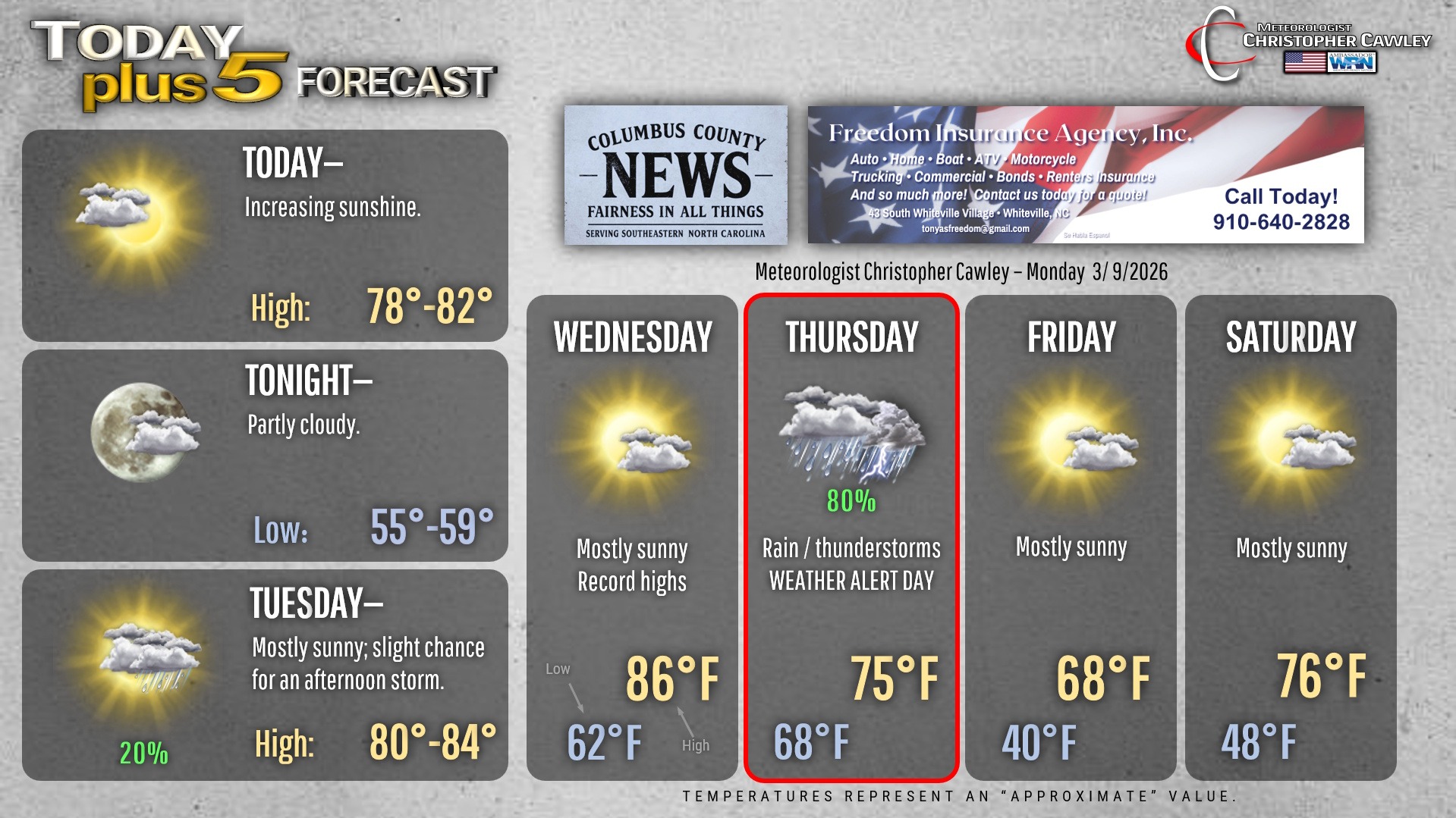 This weather update is sponsored by Freedom Insurance of Whiteville. You can trust Freedom Insurance to give you clear blue skies when it comes to home, car, boat, or whatever insurance you need. Let Freedom provide customized coverage to keep you and your family safe. Contact Freedom today at 910-640-2828!