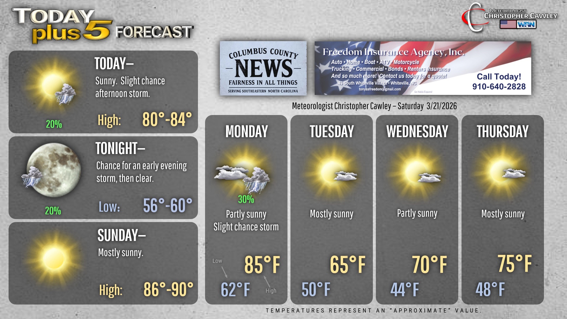 This weather update is sponsored by Freedom Insurance of Whiteville. You can trust Freedom Insurance to give you clear blue skies when it comes to home, car, boat, or whatever insurance you need. Let Freedom provide customized coverage to keep you and your family safe. Contact Freedom today at 910-640-2828!