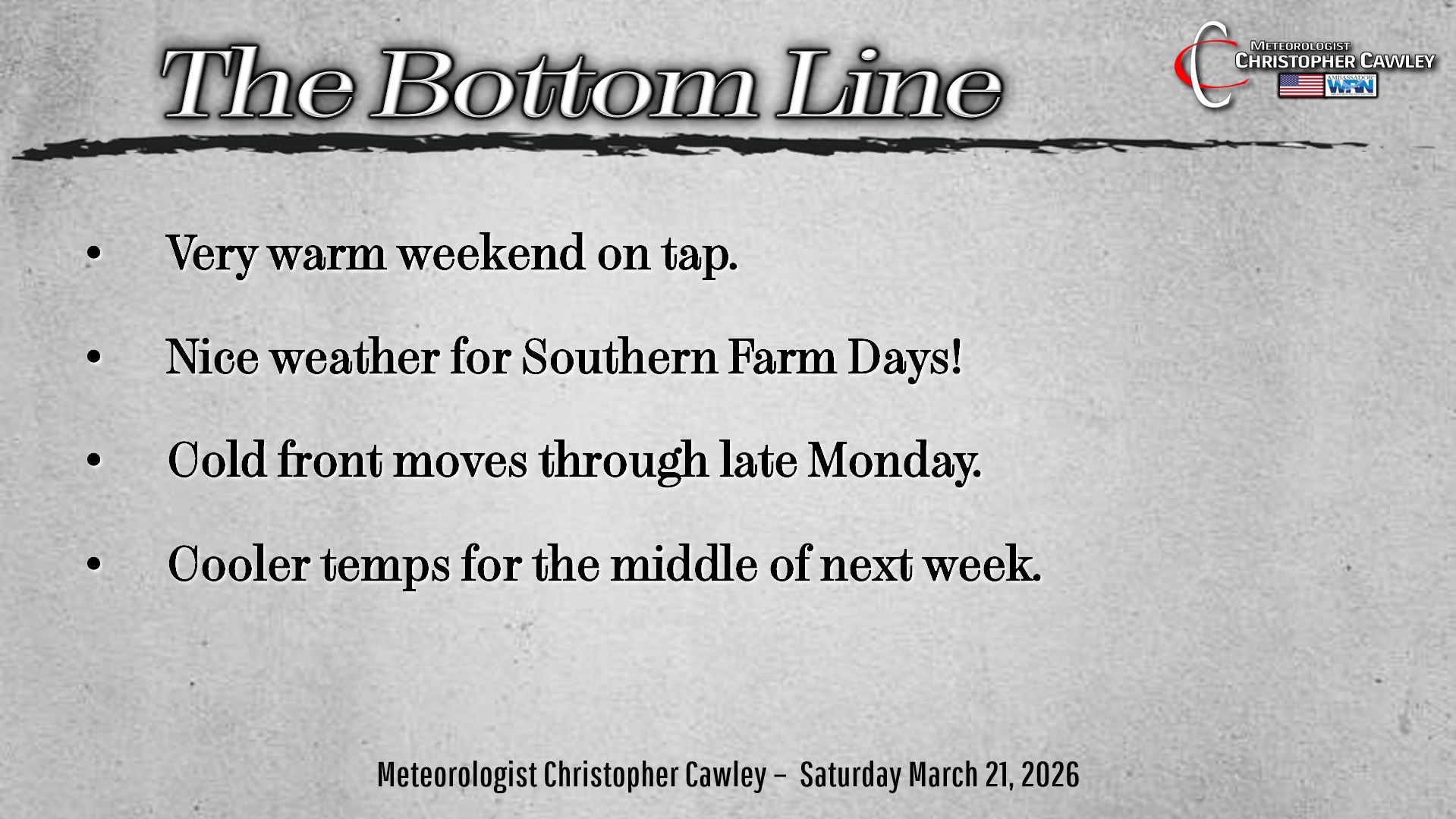 Coming out to Southern Farm Days at the Lake, bring some sunscreen and some bottled water, stay hydrated, but otherwise no weather concerns. It’s going to be a warm one though, with temps in the lower to middle 80s.
