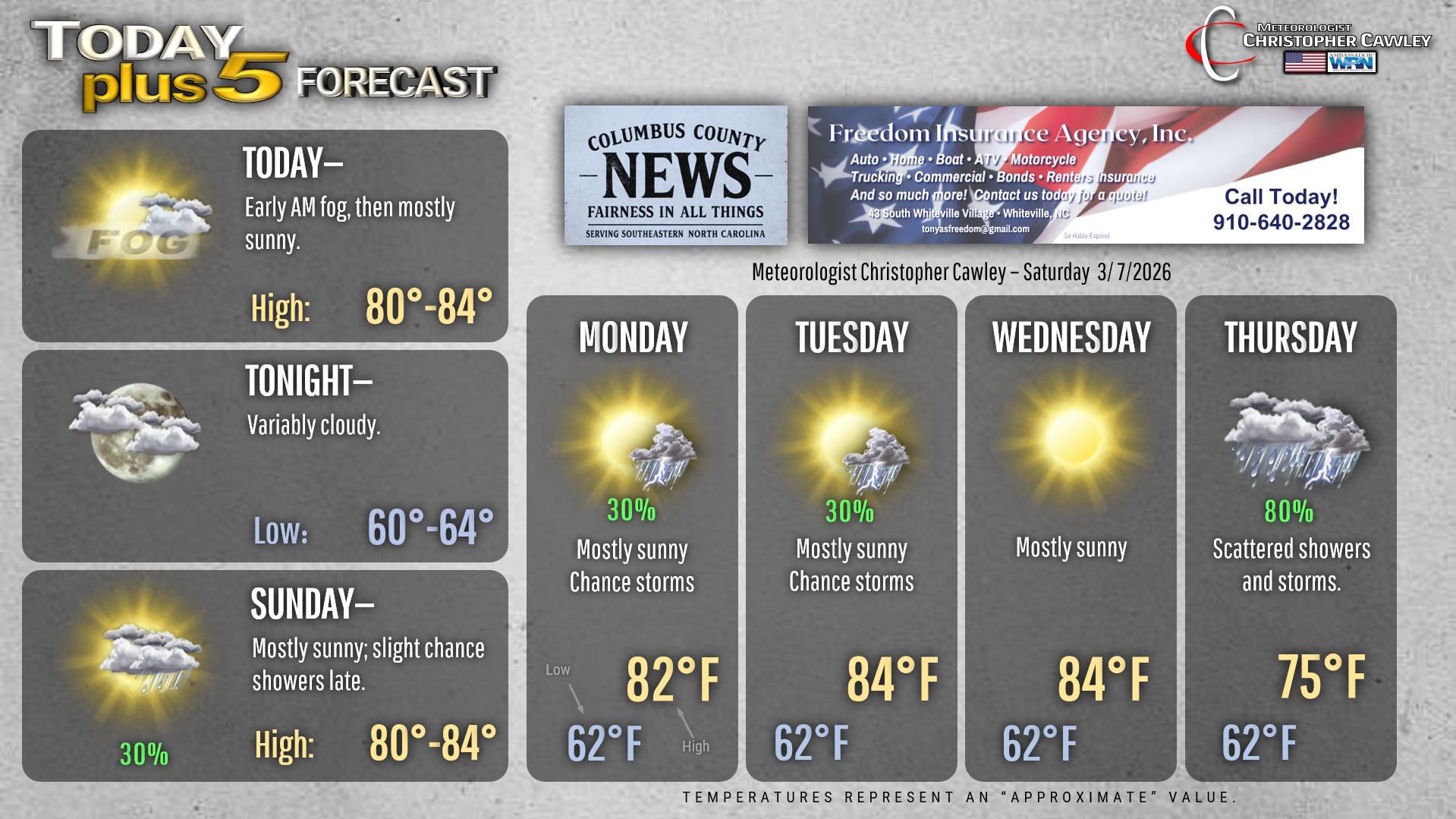 This weather update is sponsored by Freedom Insurance of Whiteville. You can trust Freedom Insurance to give you clear blue skies when it comes to home, car, boat, or whatever insurance you need. Let Freedom provide customized coverage to keep you and your family safe. Contact Freedom today at 910-640-2828!