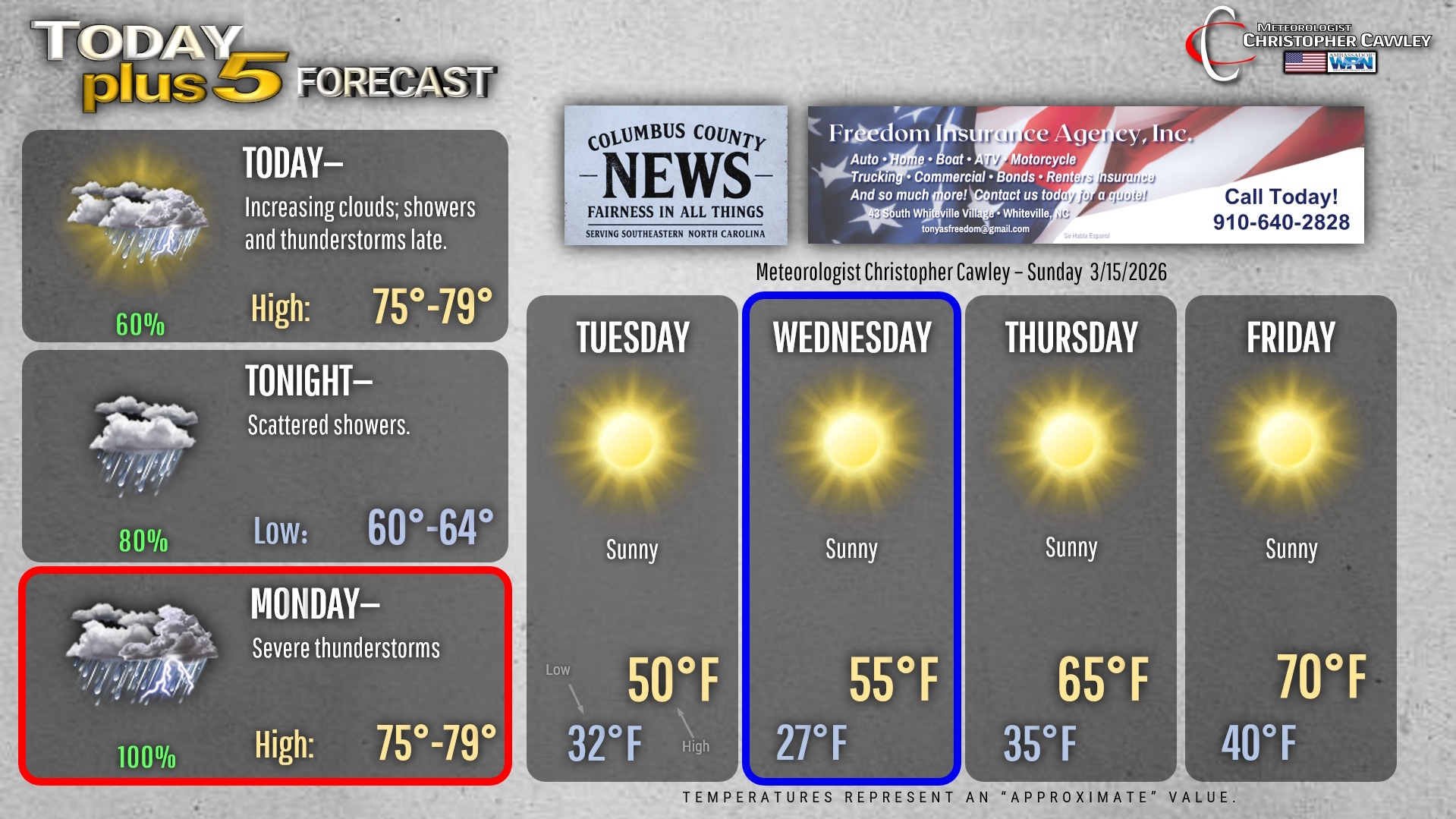 This weather update is sponsored by Freedom Insurance of Whiteville. You can trust Freedom Insurance to give you clear blue skies when it comes to home, car, boat, or whatever insurance you need. Let Freedom provide customized coverage to keep you and your family safe. Contact Freedom today at 910-640-2828!