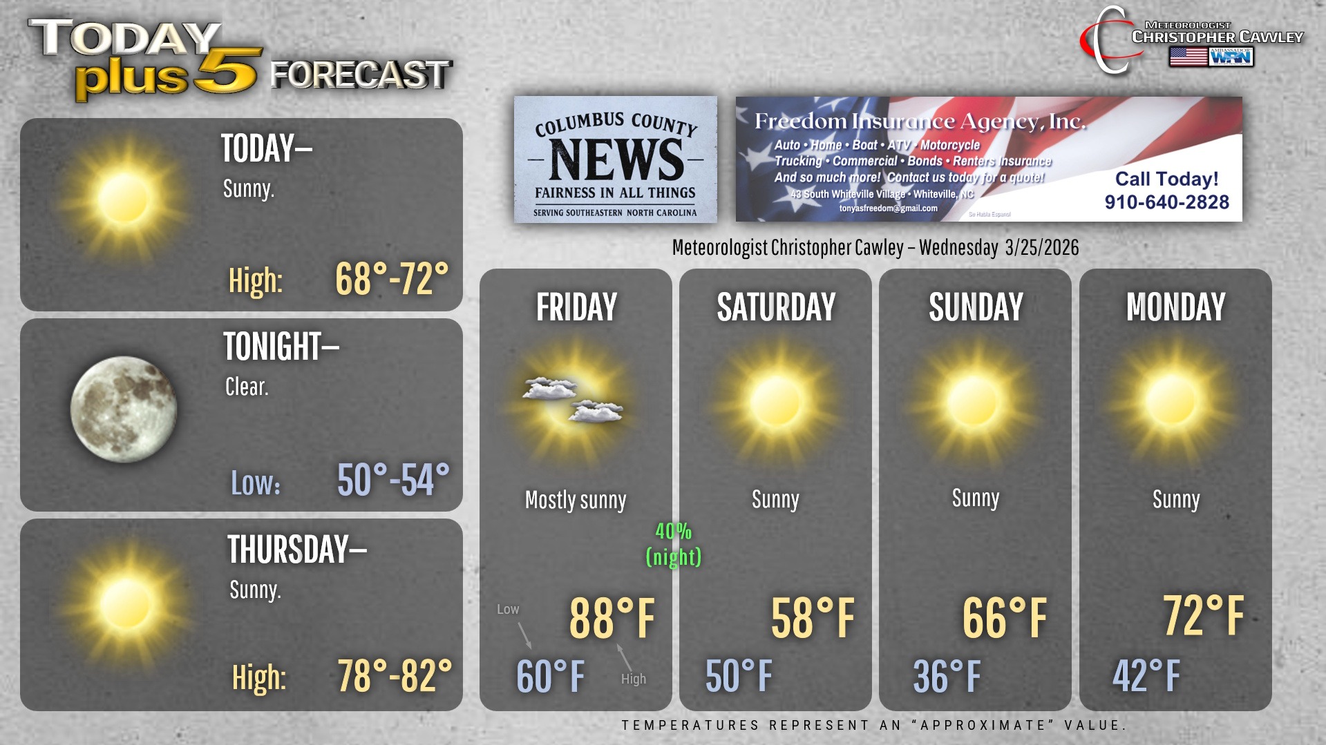 This weather update is sponsored by Freedom Insurance of Whiteville. You can trust Freedom Insurance to give you clear blue skies when it comes to home, car, boat, or whatever insurance you need. Let Freedom provide customized coverage to keep you and your family safe. Contact Freedom today at 910-640-2828!