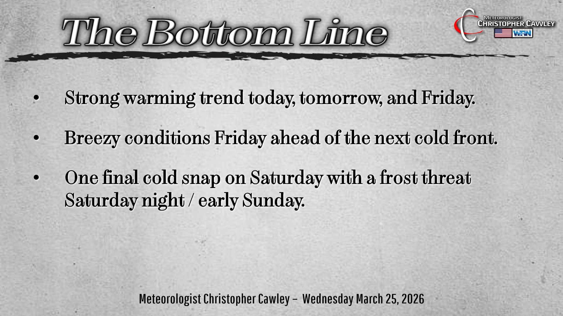 Nothing but sunshine across the area for today, tomorrow, and most of Friday with a very strong warming trend. Our high on Tuesday was 62… highs today will be 8-10 degrees warmer… highs Thursday will be 8-10 degrees warmer than that… and on Friday 5-8 degrees warmer than THAT!