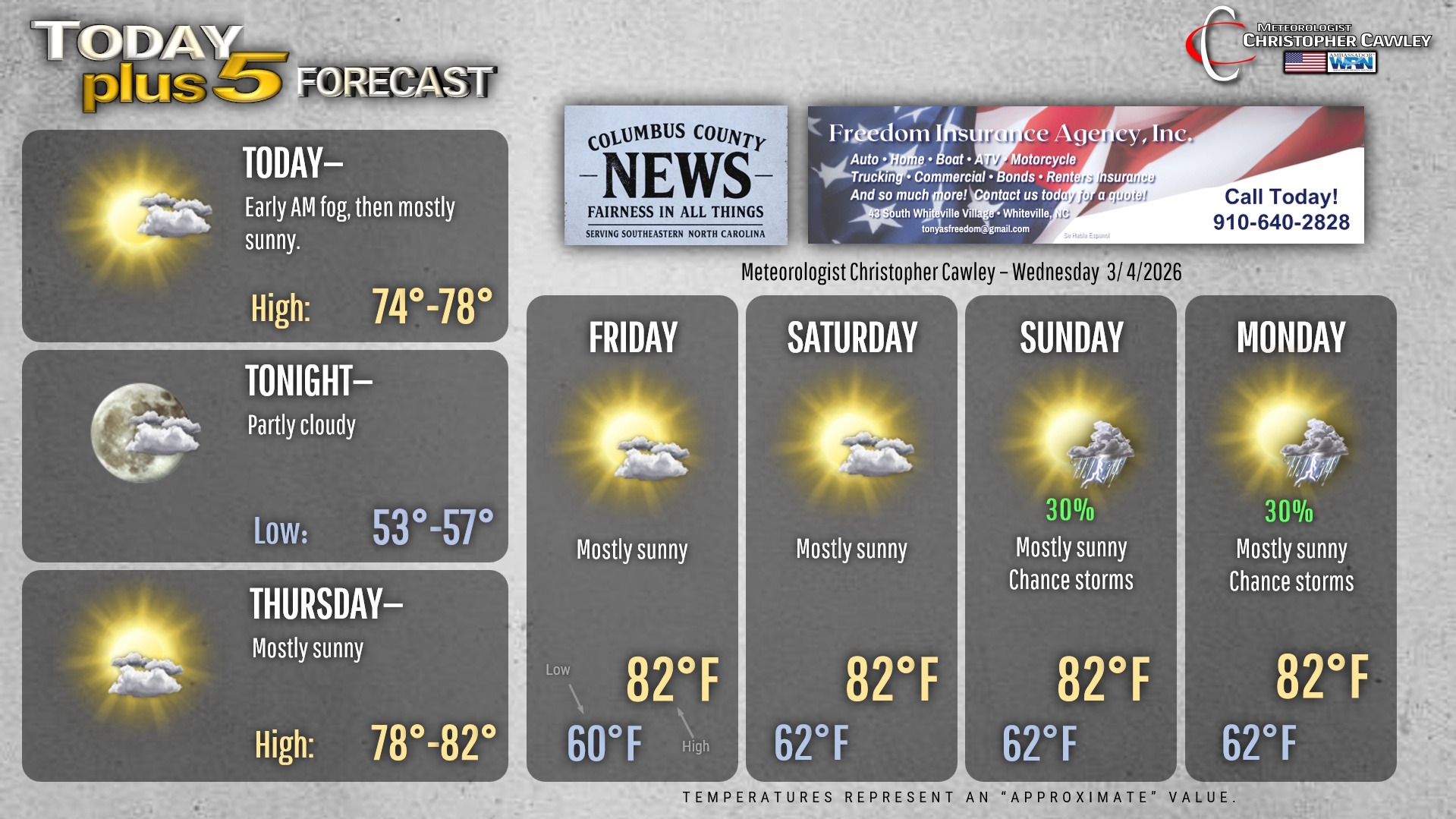 This weather update is sponsored by Freedom Insurance of Whiteville. You can trust Freedom Insurance to give you clear blue skies when it comes to home, car, boat, or whatever insurance you need. Let Freedom provide customized coverage to keep you and your family safe. Contact Freedom today at 910-640-2828!