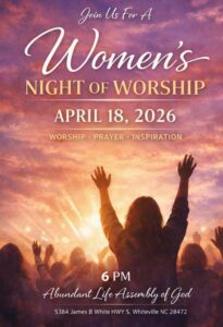 Abundant Life Assembly of God will be having a women’s night of worship on April 18 beginning at 6 p.m. All ladies are invited to attend an evening filled with worship, prayer, and inspiration. The church can be found at 5384 James B. White Highway South in Whiteville.