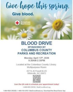 Columbus County Parks and Recreation will also be sponsoring a blood drive on April 13 from 9:30 a.m.-2:30 p.m. in the Columbus County Library Multipurpose Room.