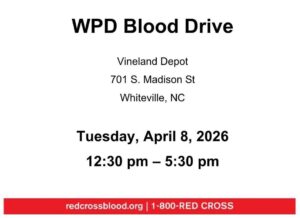 Whiteville Police Department will be hosting a blood drive on April 8 from 12:30-5:30 p.m. with the American Red Cross at Vineland Station Depot. Donating blood is a simple way to make a lifesaving difference in your community.